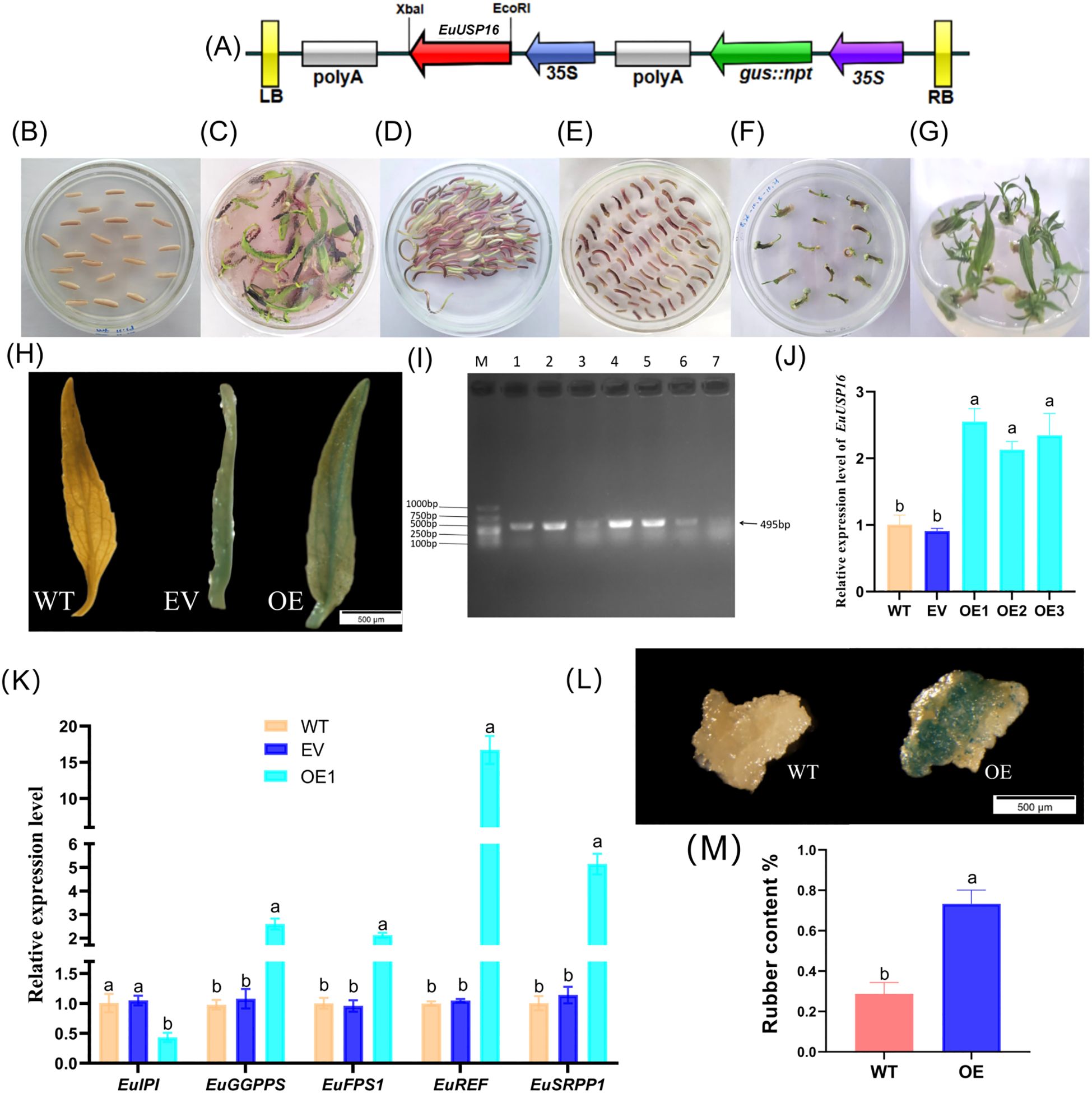 Figure 7. Functional analysis of the EuUSP16 gene. (A) T-DNA structure of the pSH737-35S-EuUSP16 vector. (B-C) Germination process of E.ulmoides seeds. (D) Co-cultivation. (E) Screening of resistant tissues. (F-G) Induction of resistant buds (H) GUS staining identification. (I) PCR verification of transgenic EuUSP16 plants. (J) Gene expression levels in transgenic EuUSP16 buds. (K) Expression of rubber synthesis-related genes in EuUSP16-overexpressing buds. (L) GUS staining of callus. (M) E.ulmoides rubber content in callus. Note: M, DL2000 marker; Different lowercase letters indicate significant differences at P<0.05.