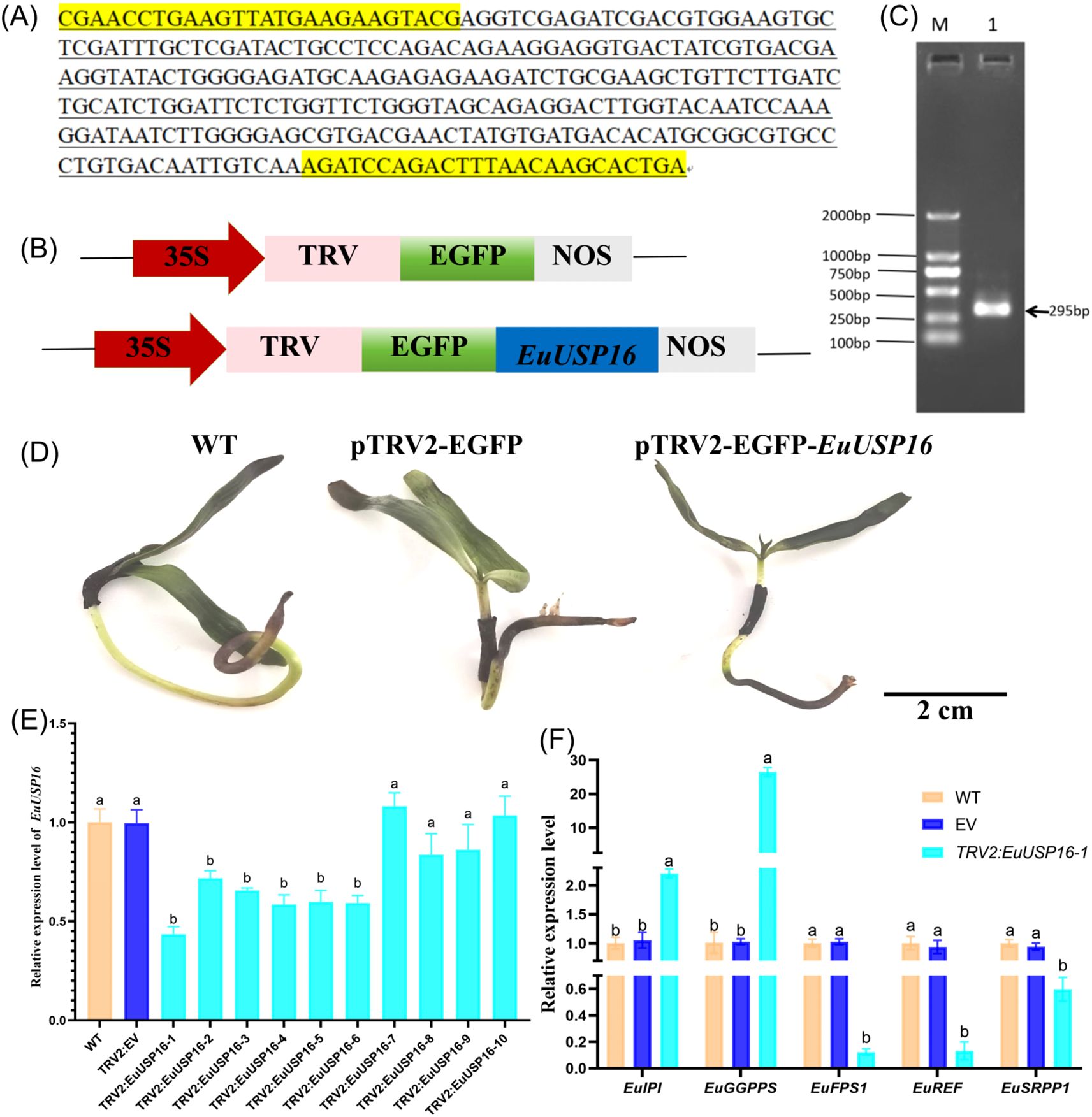 Figure 8. Effects of EuUSP16 gene silencing on the expression of rubber biosynthesis-related genes in E.ulmoides. (A) Virus-Induced Gene Silencing (VIGS) fragment. (B) Schematic diagram of pTRV2-GFP vector. (C) PCR detection results. M: DL 2000 DNA Marker Lane 1:pTRV2-GFP-EuUSP16 plasmid. (D) Phenotype of EuUSP16-silenced E.ulmoides seedlings. (E) Gene expression levels in EuUSP16-silenced E.ulmoides. (F) Expression levels of rubber biosynthesis-related genes in EuUSP16-silenced E.ulmoides. Different lowercase letters indicate significant differences (P<0.05).