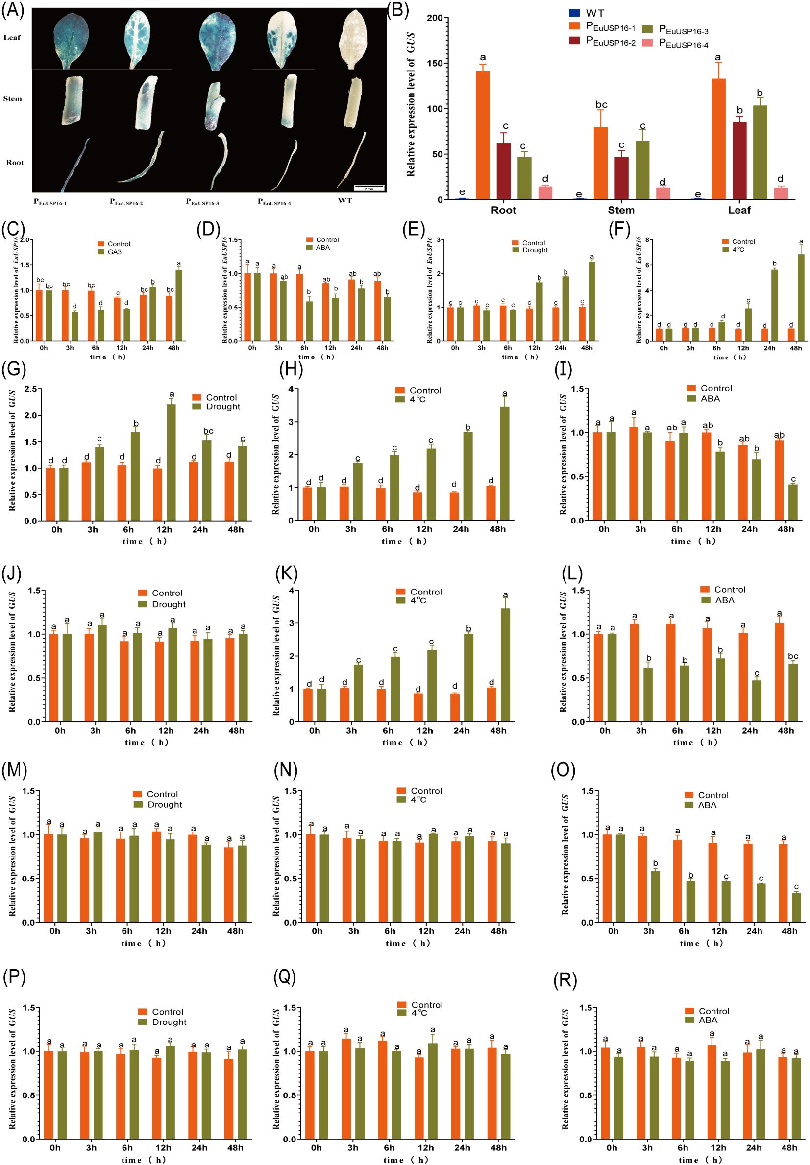 Figure 9. Effects of hormone and environmental treatments on the activity of the EuUSP16 promoter. (A) GUS histochemical staining in roots, stems, and leaves of transgenic tobacco. (B) Relative expression levels of the GUS gene in transgenic tobacco harboring four EuUSP16 promoter fragments. (C-F) Relative expression levels of EuUSP16 in E.ulmoides seedlings treated with 100 μmol·L-¹GA3, 100 μmol·L-¹ ABA, drought, and low temperature, respectively. (G-R) Relative GUS expression in transgenic tobacco carrying four EuUSP16 promoter fragments under treatments:(G-I), PEuUSP16–1 transgenic tobacco treated with 300 mmol·L-¹ mannitol (simulated drought), 4°C, or 100 μmol·L-¹ ABA spray, (J-L) PEuUSP16–2 transgenic tobacco treated identically, (M-O) PEuUSP16–3 transgenic tobacco treated identically, (P-R) PEuUSP16–4 transgenic tobacco treated identically. Control, Untreated group; 0 h: Pre-treatment baseline; Different lowercase letters indicate significant differences (P < 0.05).