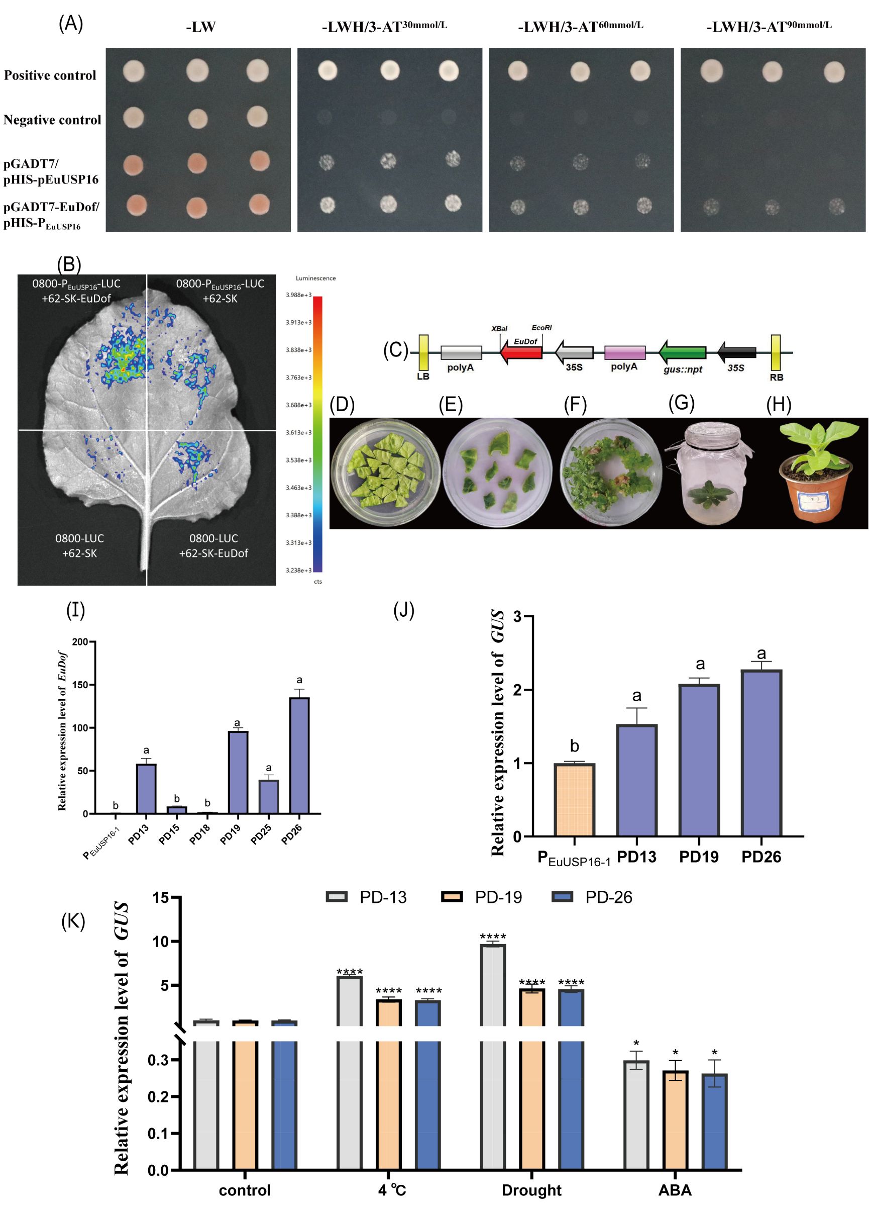 Figure 10. Interaction analysis between the EuUSP16 promoter and EuDof transcription factor. (A) Y1H one-on-one validation of PEuUSP16–1 and EuDof interaction. (B) Dual-luciferase (LUC) reporter assay. Note for b: Negative controls: 0800-PEuUSP16-LUC + 62-SK empty vector, 0800-LUC empty vector + 62-SK empty vector, 0800-LUC empty vector + 62-SK-EuDof; Experimental group: 0800-PEuUSP16-LUC + 62-SK-EuDof (C) T-DNA structure of the pSH737-35S-EuDof overexpression vector. (D) Co-cultivation of Agrobacterium with tobacco leaf discs (E). Selection of antibiotic-resistant callus. (F) Shoot induction from transgenic callus. (G) PCR identification of positive transgenic plants. (H) Potted transgenic seedlings. (I) Expression analysis of the EuDof transgene in PD transgenic tobacco lines. (J) GUS gene expression analysis in PD transgenic tobacco lines. (K) GUS expression in PD transgenic tobacco lines following 4°C, drought, or 100μmol·L-¹ABA treatments. Note: Different lowercase letters indicate significant differences (P<0.05). *P<0.05, **P<0.01, ***P<0.001, ****P<0.0001..