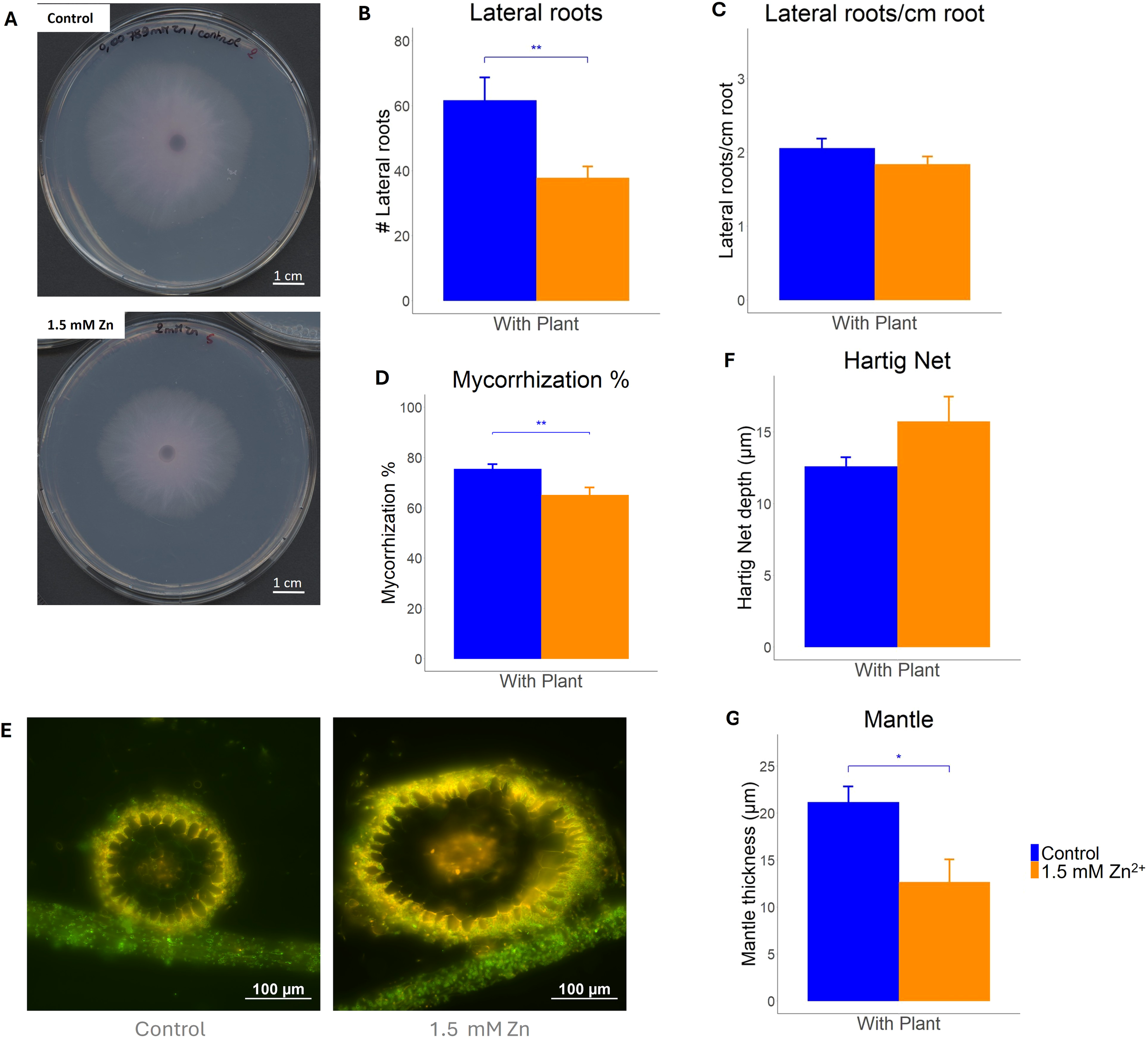 Ectomycorrhiza formed between L. bicolor S238N and P. tremula x alba 717-1B4 and grown under control (blue) and 1.5 mM Zn (orange) conditions for 14 days. (A)L. bicolor S238N mycelium grown on P5 medium supplemented with 0.008 mM Zn/control (Top) and 2 mM Zn (Bottom). (B) Average amount of lateral roots per plant grown under control or 1.5 mM Zn conditions (n ≥ 25). (C) Average ratio of lateral roots/cm root measured in roots (14 dpi) grown under control or 1.5 mM Zn (n ≥ 24). (D) Average degree of mycorrhization of Poplar roots grown under control or 1.5 mM Zn (n ≥ 24). (E) Fluorescent microscopy image of mycorrhized root cross-sections from control (Left) or 1.5 mM Zn (Right) samples stained with WGA-488 and counterstained with PI. Scale bar = 100 µm. (F) Hartig Net depth and (G) Hyphal Mantle thickness measured in WGA-488 and PI-stained mycorrhiza samples (n ≥ 8). Four measurements were made per sample. Statistical analyses were performed in R Studio using a Student’s t-test with *p<0.05 and **p<0.01. Means of all replicates + standard error (SE) are shown.