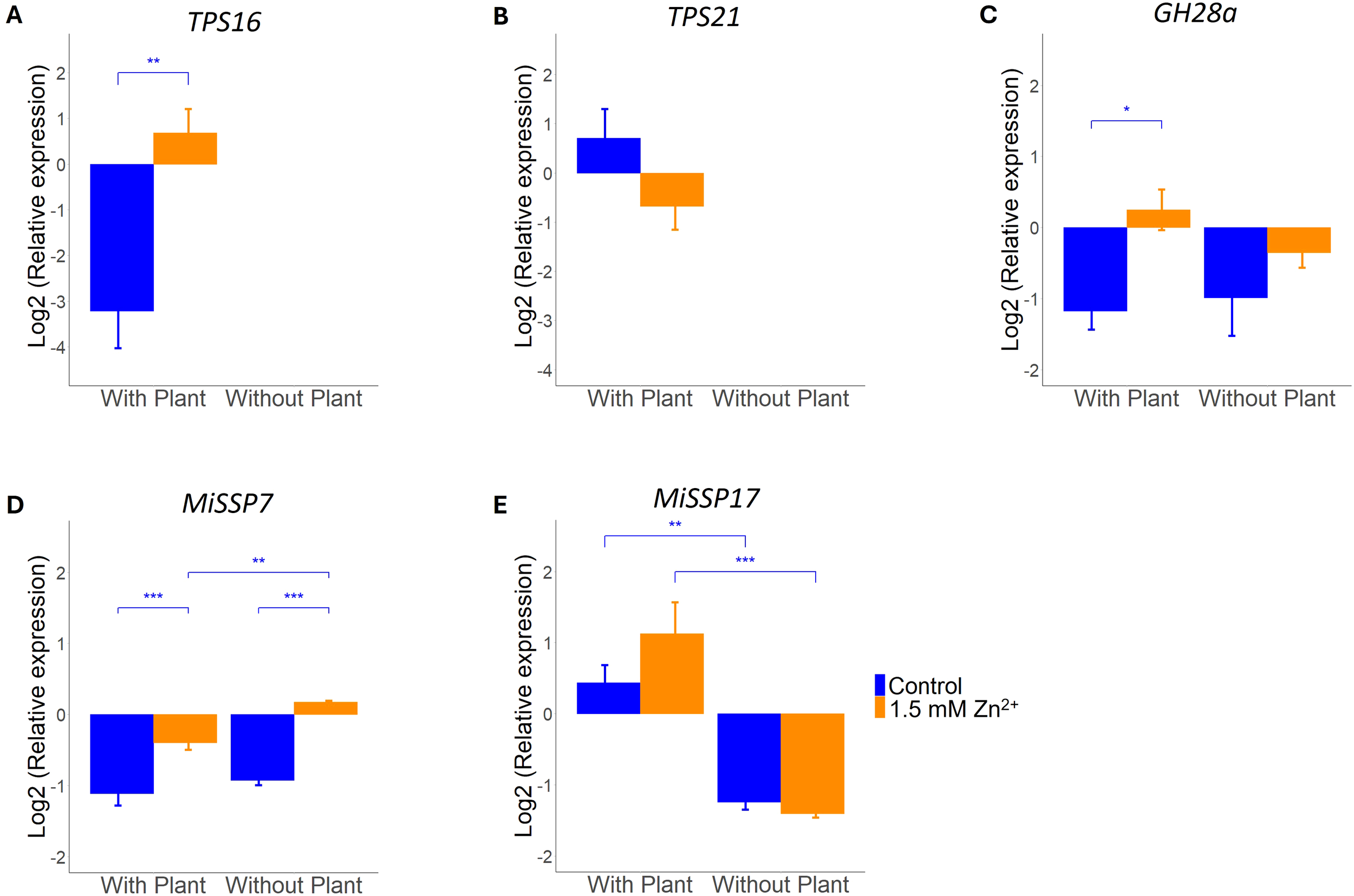 Expression of GH28a, a CAZyme expressed by L. bicolor throughout symbiosis development, was found to be significantly impacted by Zn exposure. This increase was only significant in the presence of a plant (Figure 2C) despite visibility of a similar trend in absence of the host. For MiSSP7 the increase in expression upon exposure to excess Zn was significant in both presence/absence of a host plant (Figure 2D). MiSSP17 expression, however, was not affected by excess Zn and only induced by the presence of a host plant (Figure 2E).