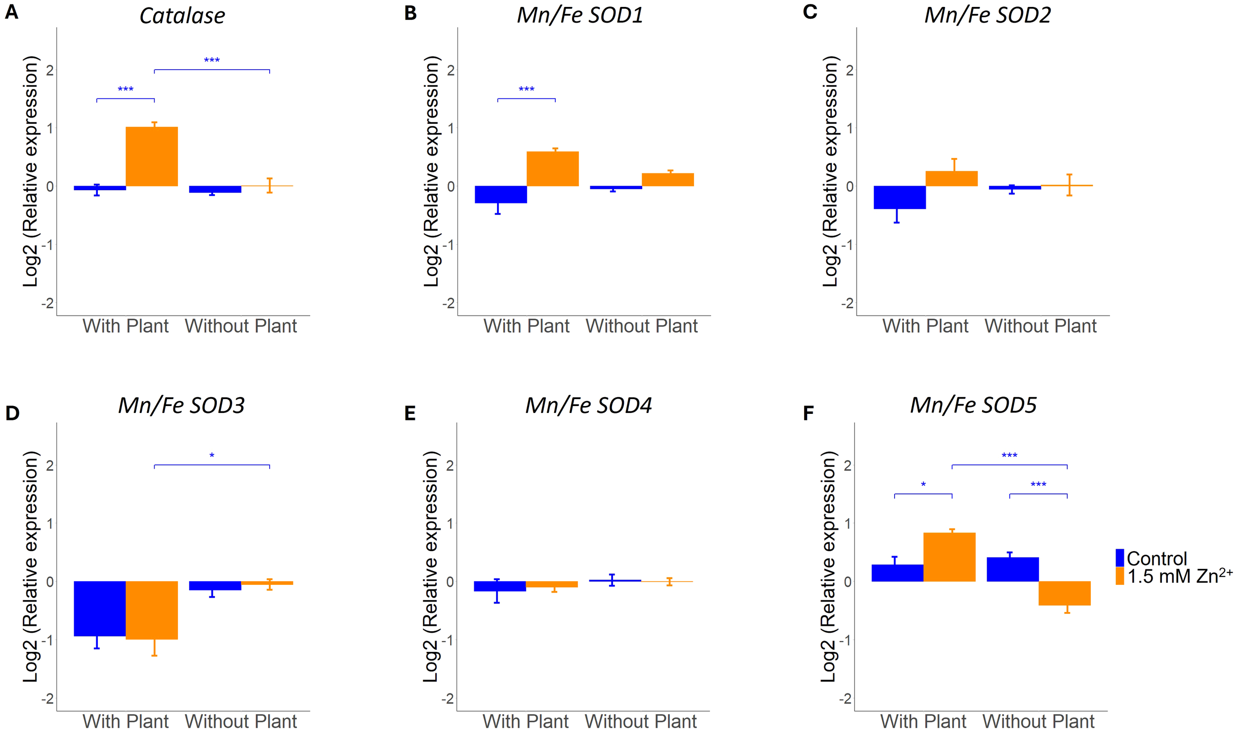 qRT-PCR analysis of L. bicolor S238N ROS scavenging genes (14 dpi) under control (blue) or 1.5 mM Zn (orange). Relative expression of (A)catalase (n = 5), (B)Mn/Fe SOD1 (n = 5), (C)Mn/Fe SOD2 (n = 5), (D)Mn/Fe SOD3 (n = 5), (E)Mn/Fe SOD4 (n = 5) and (F)Mn/Fe SOD5 (n = 5) in presence and absence of a host plant. Statistical analyses were performed in R Studio using a two-way ANOVA with TukeyHSD posthoc test. *p<0.05, **p<0.01, ***p<0.001. Means of all replicates per target gene + SE are shown.