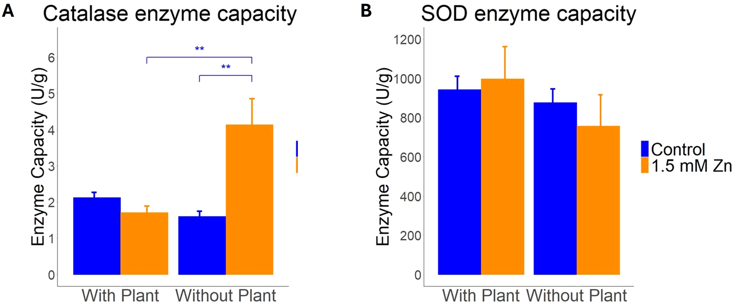 Enzyme capacity assays for (A) Catalase (n = 5) and (B) Superoxide dismutase (n = 5). Whole cell extracts from 100 mg of mycelium grown in presence or absence of a host plant, cultured for 14 days under control or 1.5 mM Zn conditions, were used. Statistical analyses were performed in R Studio using a two-way ANOVA with TukeyHSD posthoc test. ** = p<0.01. Means of all replicates for CAT or SOD + SE are shown.