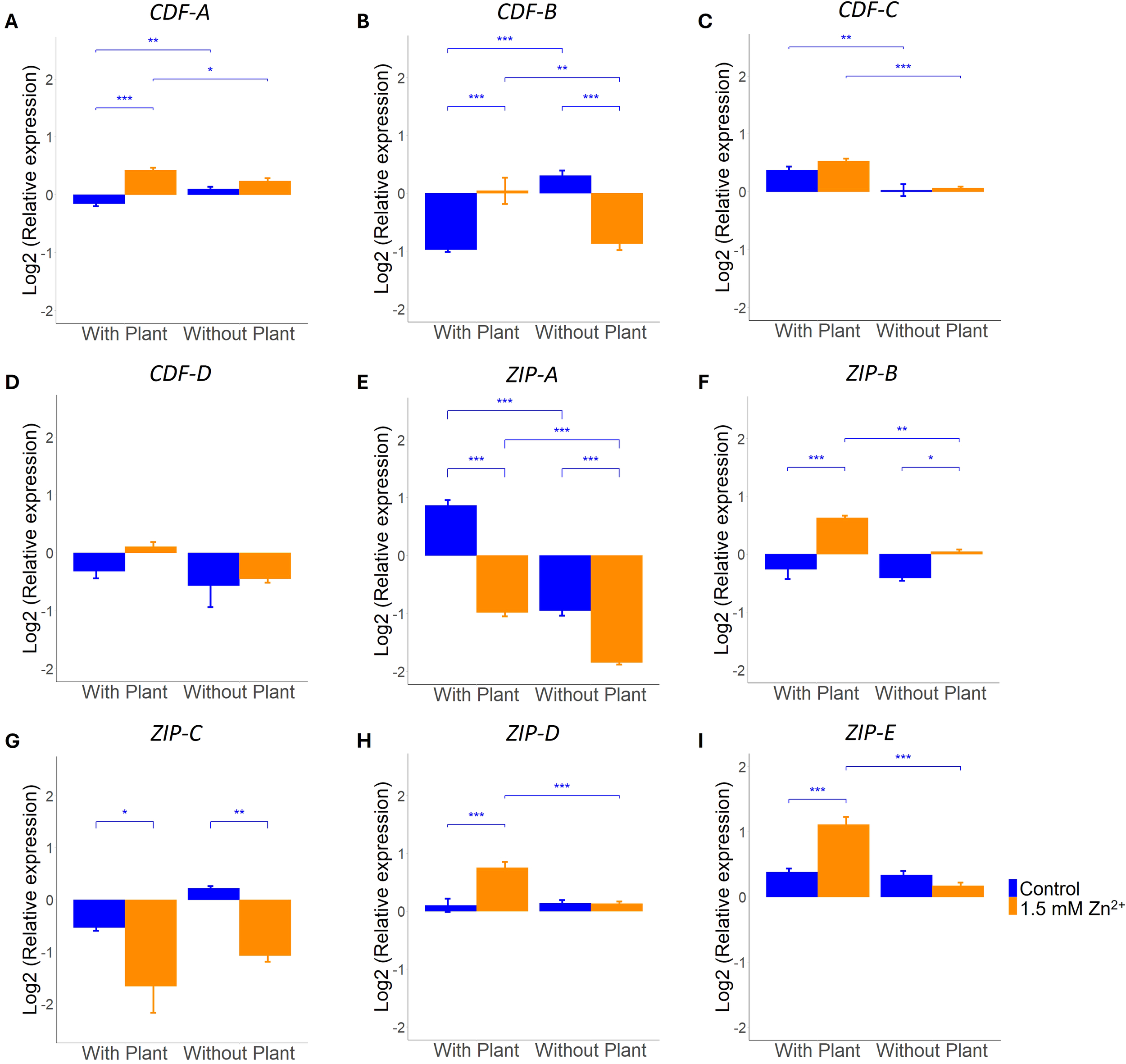 qRT-PCR analysis of L. bicolor S238N CDF and ZIP transporter genes after 14 days of incubation under control (blue) or 1.5 mM Zn (orange). Relative expression of (A)CDF-A (n = 5), (B)CDF-B (n = 5), (C)CDF-C (n = 5), (D)CDF-D (n = 5), (E)ZIP-A (n = 5), (F)ZIP-B (n = 5), (G)ZIP-C (n = 5), (H)ZIP-D (n = 5) and (I)ZIP-E (n = 5) in mycelium grown in presence or absence of a host plant. Statistical analyses were performed in R Studio using a two-way ANOVA with TukeyHSD posthoc test. *p<0.05, **p<0.01, ***p<0.001. Means of all replicates per target gene + SE are shown.