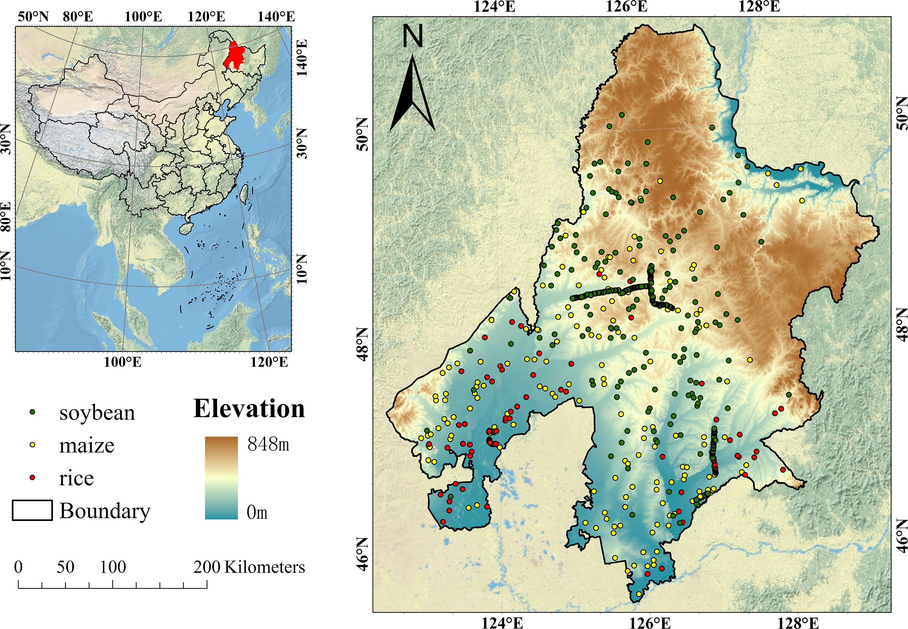 This study collected a total of 1,424 ground sample points for soybean, maize, and rice in the study area for the year 2019, including 621 soybean samples, 588 maize samples, and 215 rice samples. These samples were collected with a mobile GIS device and subsequently checked against high-resolution Google Earth imagery and two seasonal Sentinel-2 RGB composites. Samples with mislabeling or located on roads and field boundaries were removed. The dataset was randomly divided into training and validation sets with a ratio of 8:2. A cropland mask was applied to exclude non-cropland pixels and prevent their inclusion in the crop classification process. Both the crop sample data and the cropland mask used in this study were derived from the 2019 Cropland Data Layer (CDL2019) for Northeast China (You et al., 2021).