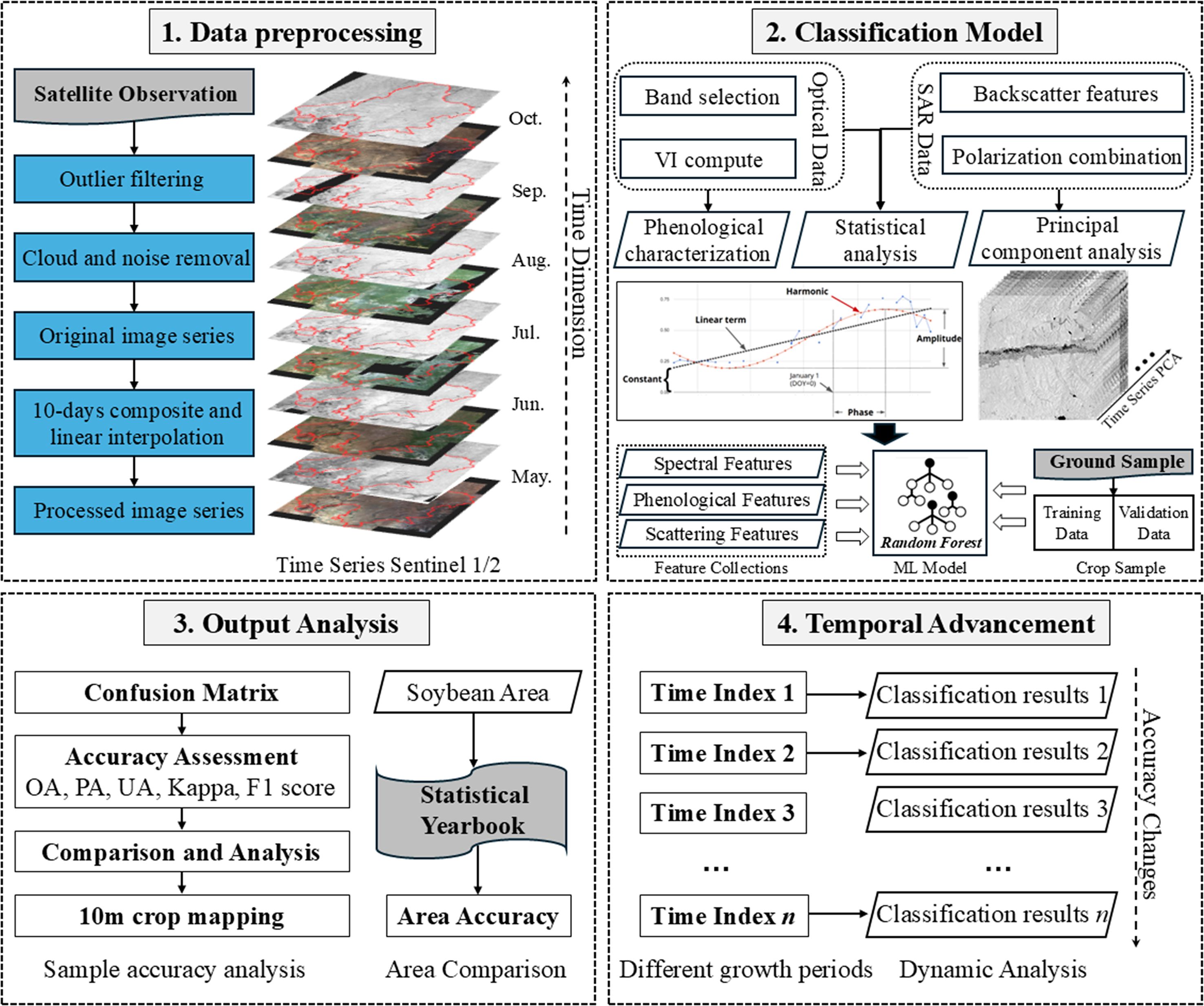 Remote sensing has emerged as a powerful tool for large-scale, dynamic, and continuous land surface monitoring. It enables efficient identification and spatiotemporal analysis of agricultural features (Weiss et al., 2020; Bian et al., 2023), meeting the precision requirements of modern smart agriculture while reducing labor and financial input. By providing timely and consistent crop information from space, satellite technology helps stabilize supply chains, supports better policy decisions, and ultimately strengthens national and global food security. However, in major soybean-producing regions of China, soybean, maize, and rice are the dominant crops cultivated within the same agricultural landscape. Among these, soybean and maize exhibit high phenological and spectral similarity, especially during the early pod-setting stage, making their discrimination via single-source optical data extremely challenging (Chen et al., 2023; You et al., 2023; Zhang et al., 2024). Meanwhile, as a typical paddy crop, rice differs from upland soybean and maize in water demand and growth environment, yet its spectra can overlap with soybean in specific phenological phases, like seedling stage with sparse canopy, under cloud-contaminated optical data. Thus, developing high-accuracy and efficient mapping methods that simultaneously distinguish soybean from maize and rice is critical for optimizing cropping structures, increasing yields, and ensuring national food security (Li et al., 2023).