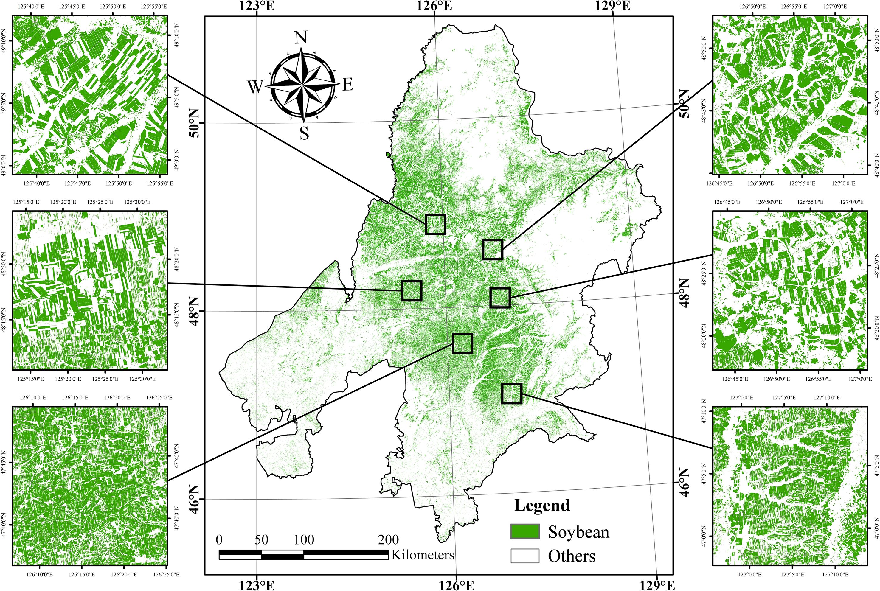 Soybean (Glycine max) is one of the most important plant-based protein crops worldwide. Its high protein and oil content have made it a globally cultivated crop, playing a central role in both food and feed systems (Schmutz et al., 2010; Liu et al., 2017). In China, soybean serves as both a staple and an economic crop, yet domestic production meets only a small fraction of national demand (She et al., 2024). Accurate and timely information on the spatial distribution of soybean cultivation is essential for assessing planting scale, informing policy implementation, and supporting efforts to boost domestic production (Johnson and Mueller, 2021; Wei et al., 2023).