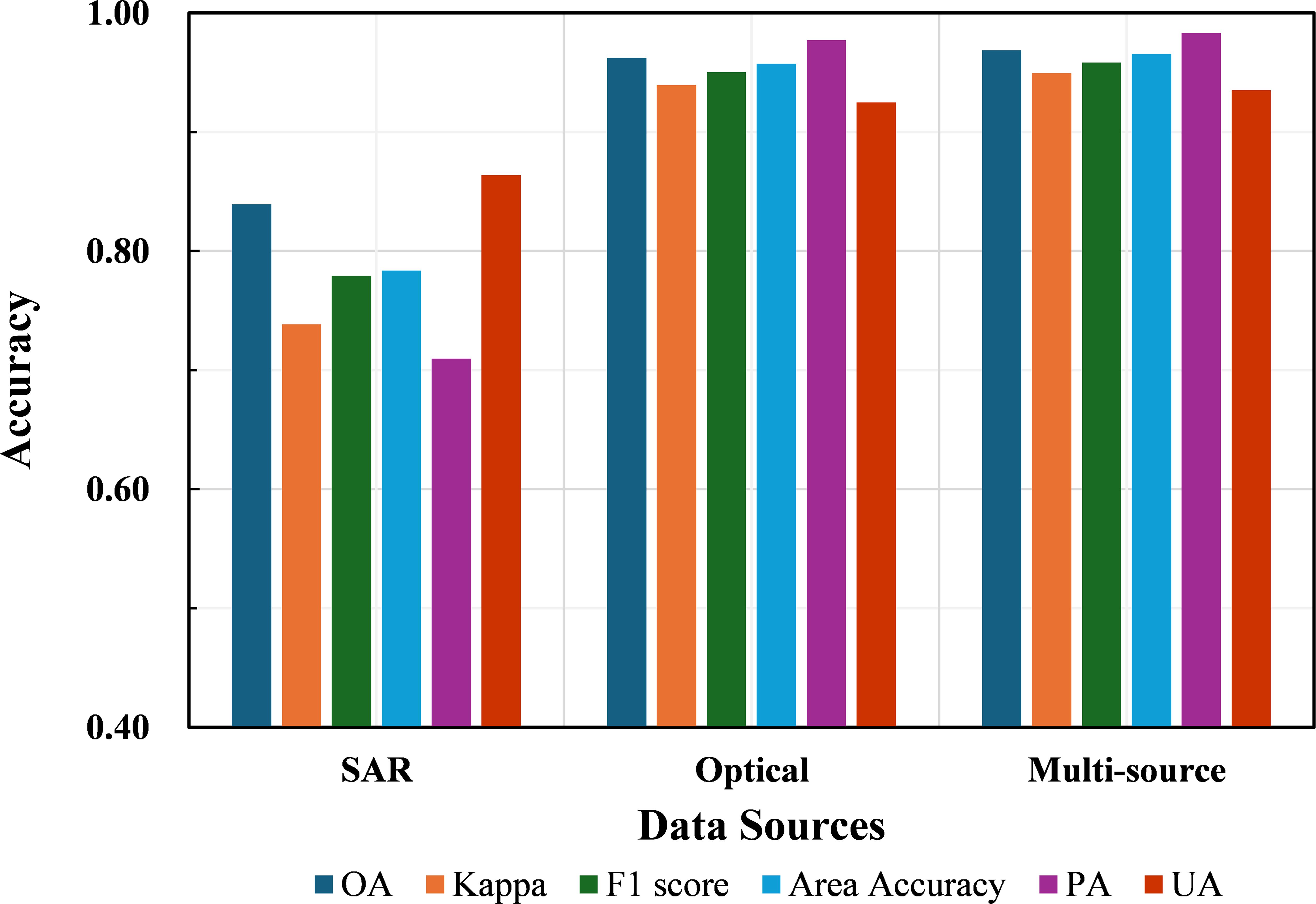 In terms of classification performance using individual data sources (Figure 5), the overall accuracy (OA) and Kappa coefficient based solely on SAR data reached 83.92% and 0.7384, respectively. Although these values are lower than those achieved using optical data, SAR still exhibits a certain level of capability in crop discrimination. In contrast, the optical-only approach delivered significantly higher performance, with OA and Kappa values of 96.23% and 0.9394, respectively—second only to the multi-source fusion method—highlighting its strong ability to distinguish between crop types. When integrating both optical and SAR data, the multi-source fusion approach achieved the highest accuracy, with an OA of 96.85% and a Kappa coefficient of 0.9494. Compared with the optical-only approach, this represents an improvement of 0.62% in OA and 0.0099 in Kappa; compared with the SAR-only method, the improvement is more substantial—14.93% in OA and 0.2010 in Kappa. These results suggest that multi-source fusion can further enhance classification performance, even when starting from a high baseline, though the incremental gains over optical data alone are relatively modest.