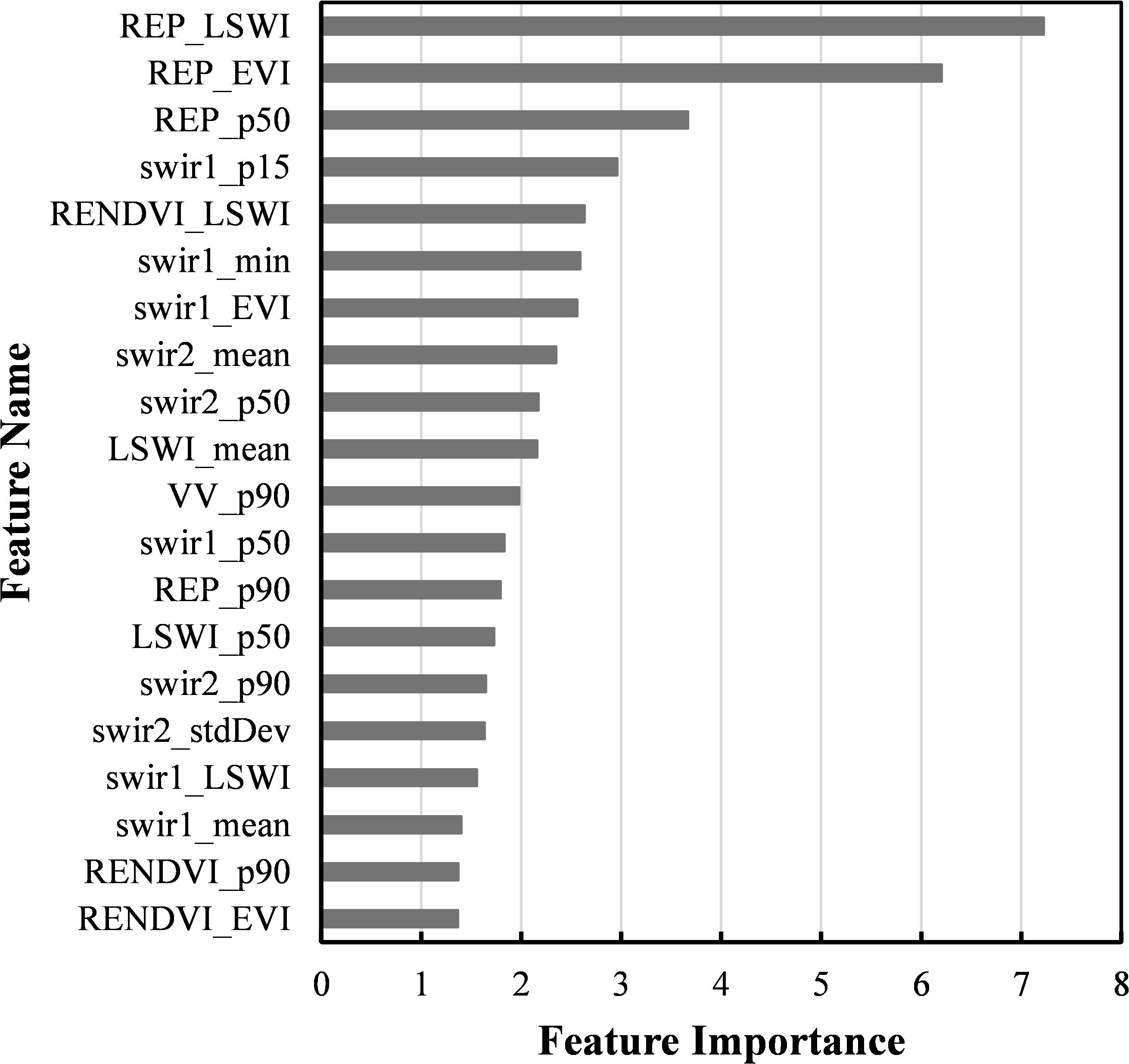 The suffixes in the feature names denote specific types of information: “_EVI” and “_LSWI” represent feature values extracted during the respective peak periods of the EVI and LSWI indices; “_p15,” “_p50,” and “_p90” correspond to the 15th, 50th (median), and 90th percentiles; while “_min,” “_max,” “_mean,” and “_stdDev” denote common statistical measures, including minimum, maximum, mean, and standard deviation. The feature importance ranking indicates that REPI-related features occupy the highest positions, particularly those derived from the wettest and greenest composites, as well as median values. This highlights their critical role in crop classification, especially for soybean identification, and aligns well with the results from temporal curve analysis. Features from the shortwave infrared bands (SWIR1 and SWIR2) also demonstrate strong discriminative power, comprising 10 of the top 20 features. Additionally, LSWI and RENDVI features appear frequently, contributing to the effective identification of rice and to the differentiation between soybean and maize, respectively. Among SAR-derived features, only the 90th percentile of VV polarization is included in the optimal subset, suggesting the dominance of optical features within the multi-source dataset. This finding is consistent with previous studies reporting that Sentinel-1 and Sentinel-2 data contribute approximately 27% and 73%, respectively, to overall crop classification accuracy. Moreover, the frequent presence of growth peak features and 90th percentile values reflects that crops exhibit their greatest spectral separability during peak growth stages.