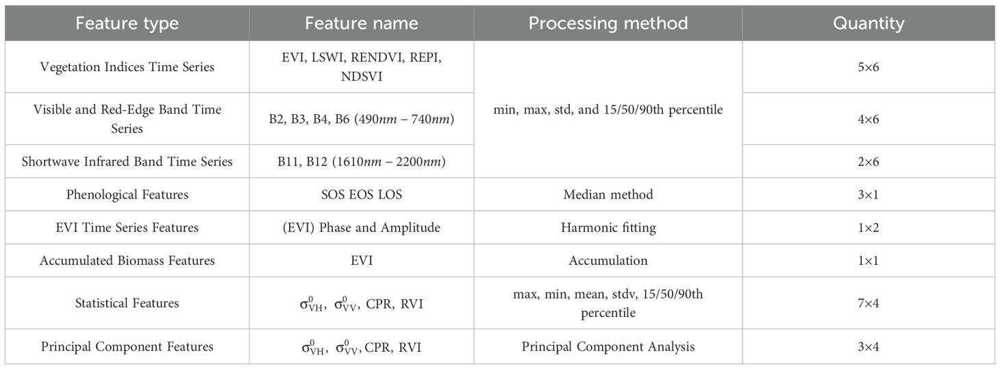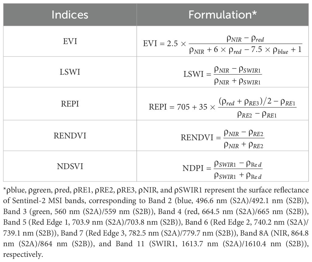 To improve crop classification performance, this study selected a set of parameters for feature extraction based on the physiological and biochemical characteristics of soybean growth. Two categories of spectral data were employed to classify soybean and other crop types: (1) reflectance values from six spectral bands, and (2) values from five vegetation indices (Table 1). The six spectral bands included Red (492.4 nm), Green (559.8 nm), Blue (664.6 nm), Red Edge 2 (RE2, 740 nm), Shortwave Infrared 1 (SWIR1, 1610 nm), and Shortwave Infrared 2 (SWIR2, 2190 nm). Previous studies have highlighted the potential of SWIR1, SWIR2, and RE2 bands in effectively distinguishing between maize and soybean (Luo et al., 2021; Chen et al., 2023). In addition, six widely used spectral indices were calculated: Enhanced Vegetation Index (EVI), Land Surface Water Index (LSWI), Red Edge Position Index (REPI), Red Edge Normalized Difference Vegetation Index (RENDVI), and Normalized Difference Senescence Vegetation Index (NDSVI). The EVI time series is commonly used to extract temporal and phenological features for various crops. LSWI, which is sensitive to both leaf and soil moisture, is particularly effective for distinguishing rice from upland crops such as maize and soybean. REPI and RENDVI, which utilize Sentinel-2 red edge bands, are well-suited for estimating canopy chlorophyll content and nitrogen levels.