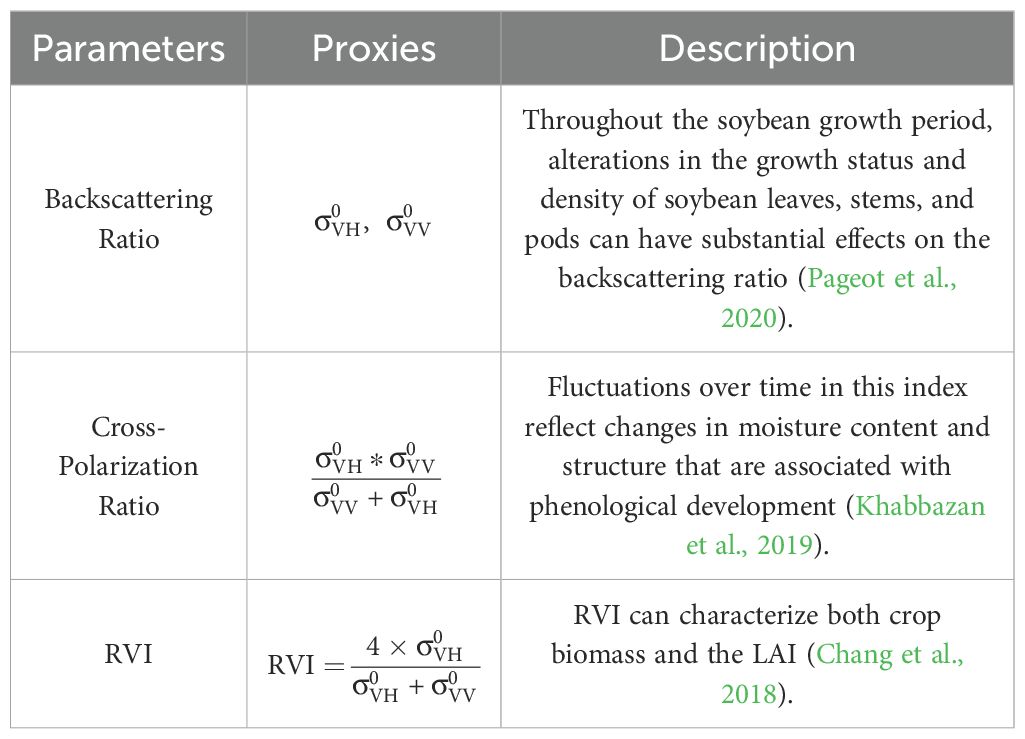 To improve soybean identification accuracy under cloudy conditions, this study selected five key parameters from Sentinel-1 VV/VH dual-polarized SAR imagery to capture crop structural and physical characteristics across different growth stages (Table 2). These SAR features include the backscatter coefficients of the VV and VH polarization channels ( and ), their combined forms, and the dual-polarization Radar Vegetation Index (RVI) derived from these channels. The and coefficients reflect the radar backscattering response from vertical and horizontal plant structures, respectively (Pageot et al., 2020). VV polarization is more sensitive to vertical canopy characteristics and is thus closely related to soybean biomass and canopy density, while VH polarization responds more strongly to variations in surface roughness and structural complexity, making it useful for detecting changes during mid to late phenological stages. RVI, a normalized index computed from the VV and VH channels, effectively characterizes crop canopy vigor and growth dynamics (Mandal et al., 2020). Additionally, the Cross-Polarization Ratio (CPR), defined as the ratio of the product to the sum of and , enhances sensitivity to backscatter intensity during key phenological events such as the pod-filling stage (Veloso et al., 2017). Collectively, these SAR-derived parameters provide essential physical and temporal insights that support robust soybean classification in multi-source remote sensing applications.