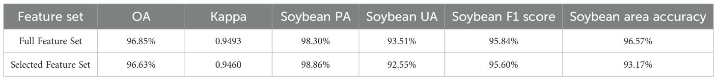 Feature selection was conducted using the Mean Decrease in Impurity (MDI) metric from the Random Forest classifier to assess the importance of each variable. Based on their importance scores, all features were ranked, and a subset comprising the top-ranked 20 features was identified as optimal (Figure 7). Table 4 compares the classification performance of the full feature set and the selected subset. The results indicate that the subset yields classification accuracy largely comparable to that of the full set. The most notable difference is a roughly 1% decrease in user accuracy (UA) for soybean in the reduced feature set, resulting in a more pronounced overestimation of soybean area and a corresponding 3.4% decline in area-based accuracy. Minor reductions were also observed in overall accuracy (OA), Kappa coefficient, and soybean F1 score, each by approximately 0.3%. Notably, this reduction in feature dimensionality achieved an 87% decrease in data volume. Therefore, the selected 20-feature subset offers a favorable trade-off, maintaining high classification accuracy while significantly improving computational efficiency.