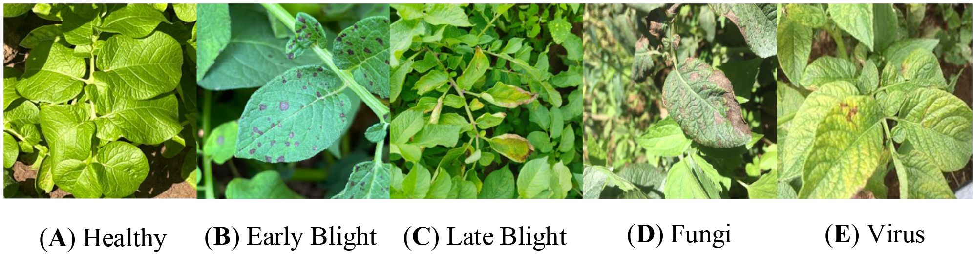 Figure 1. Sample images of potato leaf diseases. (A) Healthy, (B) Early Blight, (C) Late Blight, (D) Fungi, (E) Virus.