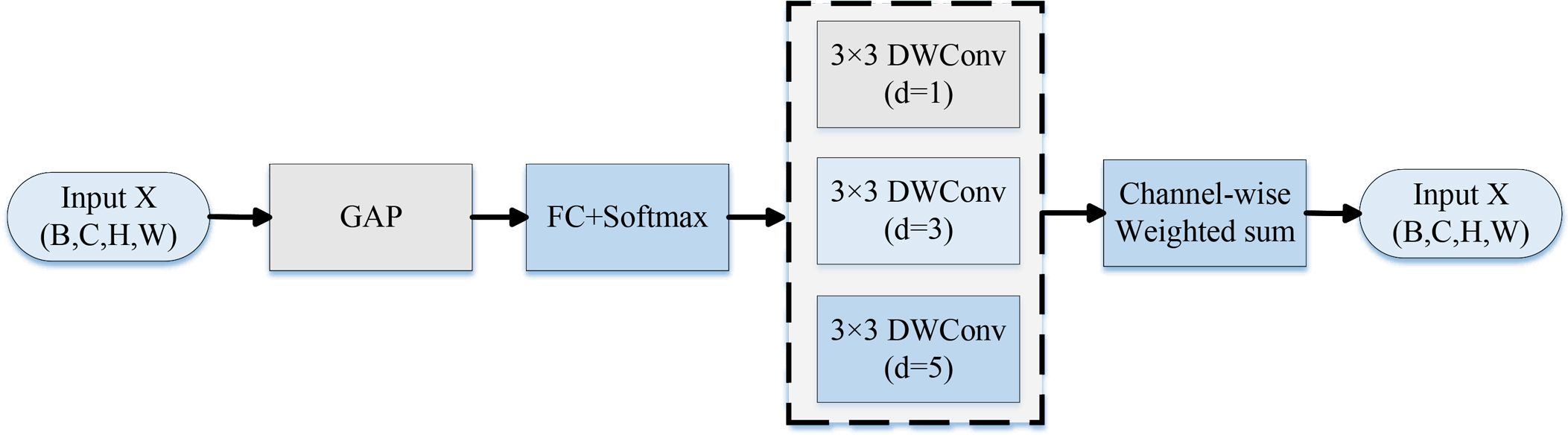 Before calculating the channel attention, the features X (B, C, H, W) are first input into the DDC for feature extraction. The channel attention mechanism uses global information to adaptively assign weights with varying expansion rates by computing the global average pooling (GAP). This allows the network to dynamically modify the receptive field according to an input picture. The formulas are given in (Equations 7, 8):