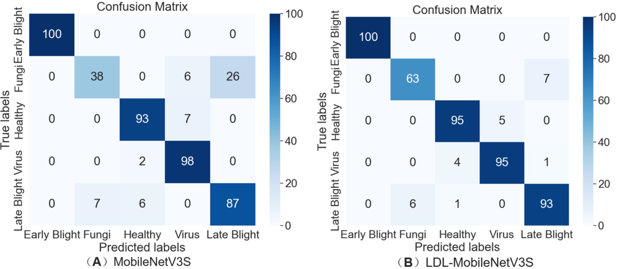 Figure 8. Confusion matrix for the LDL-MobileNetV3S model on the validation set. (A) MobileNetV3S, (B) LDL-MobileNetV3S.