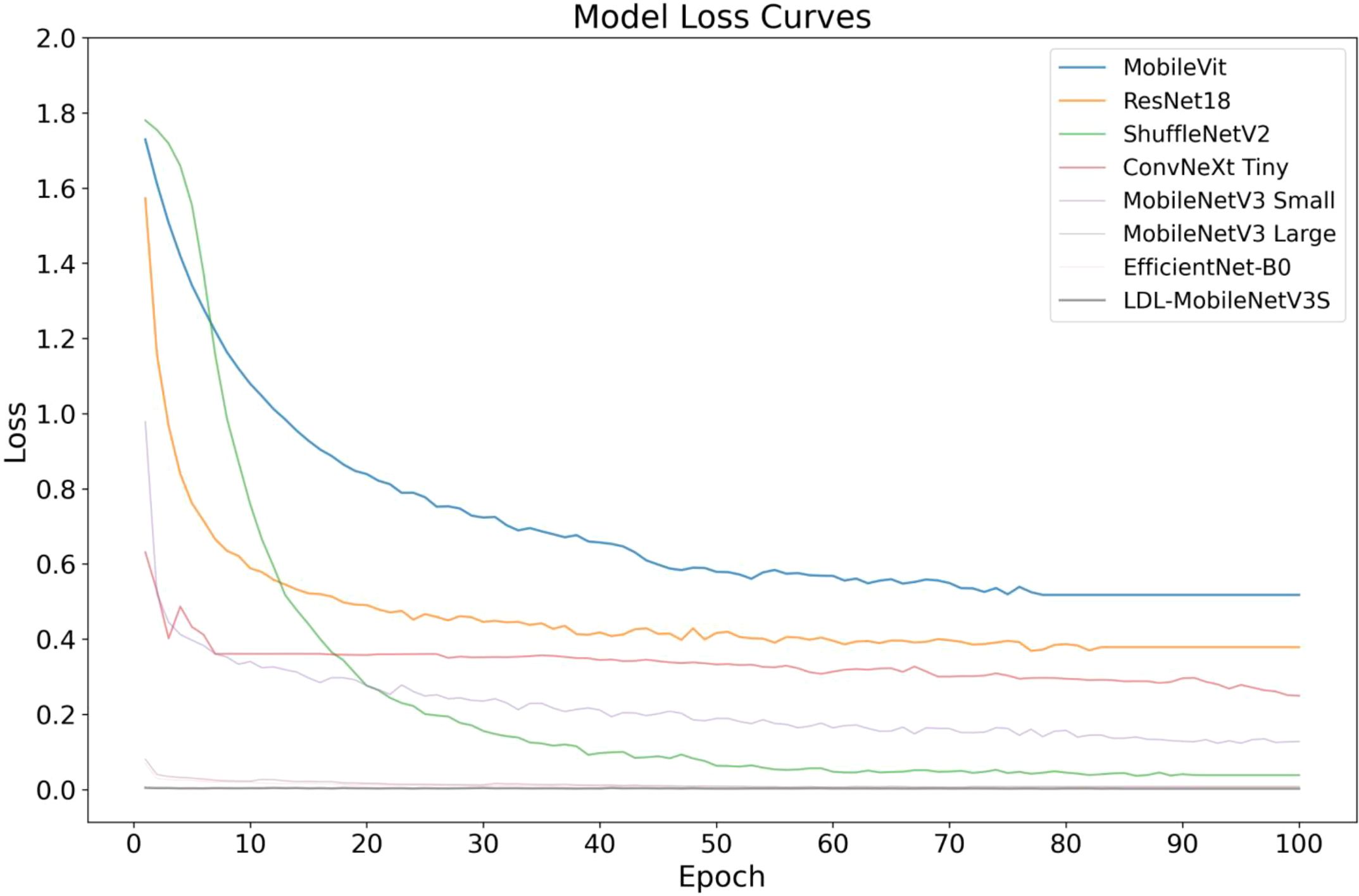 Figures 10, 11 shows the convergence and classification performance of each model during training. It is evident that the LDL-MobileNetV3S model can efficiently learn features from the data and converge rapidly, as shown by the low loss values during training and the rapid decline in the early stages of training. The loss curve of the current model shows more consistent and lower loss values throughout training compared to previous models (such as MobileViT and ResNet18), indicating that it is more adept at optimizing model parameters. Additionally, the model outperforms previous network architectures in terms of accuracy on the test set, demonstrating a quicker rate of accuracy improvement in the early training phases and ultimately stabilizing at approximately 94.89% at 100 epochs. In contrast, other models, including MobileViT and ResNet18, exhibit slower accuracy growth and lower final accuracy.