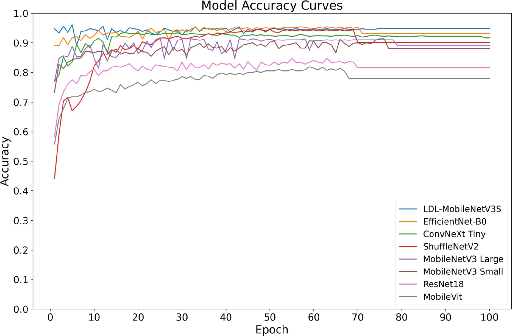 The high accuracy of the LDL-MobileNetV3S model is attributed to its lightweight architecture combined with the LF and DDC modules, which enable the model to more effectively capture disease features at multiple scales. In comparison, although EfficientNet-B0 and ShuffleNetV2 also demonstrate relatively strong performance, their final accuracy is lower than that of the LDL-MobileNetV3S model.