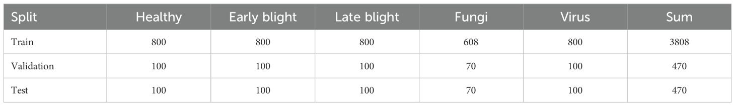The dataset employed in this study comprises two primary components: publicly available data and self-acquired data. The majority of the public data were sourced from the PlantVillage platform. The dataset comprised 2400 images of potato leaves gathered under field conditions. These images were predominantly captured under controlled conditions (e.g., consistent lighting and background), resulting in high image quality and clarity. Such controlled environments facilitate the extraction of robust training features for the model. In August 2024, the research team conducted the field component of the self-acquisition process at the Xufeng Potato Experimental Base in Wuchuan County, Hohhot City. Utilizing a Huawei Mate 60 smartphone, they captured images of 2348 instances of potato leaf diseases. This subset of images, which accurately captured field environmental elements such as natural lighting, complex backgrounds, and leaf shading, enhanced the model’s ability to adapt to complex real-world scenarios.