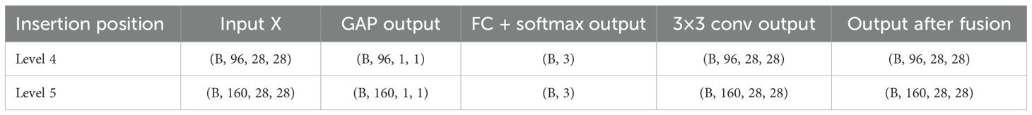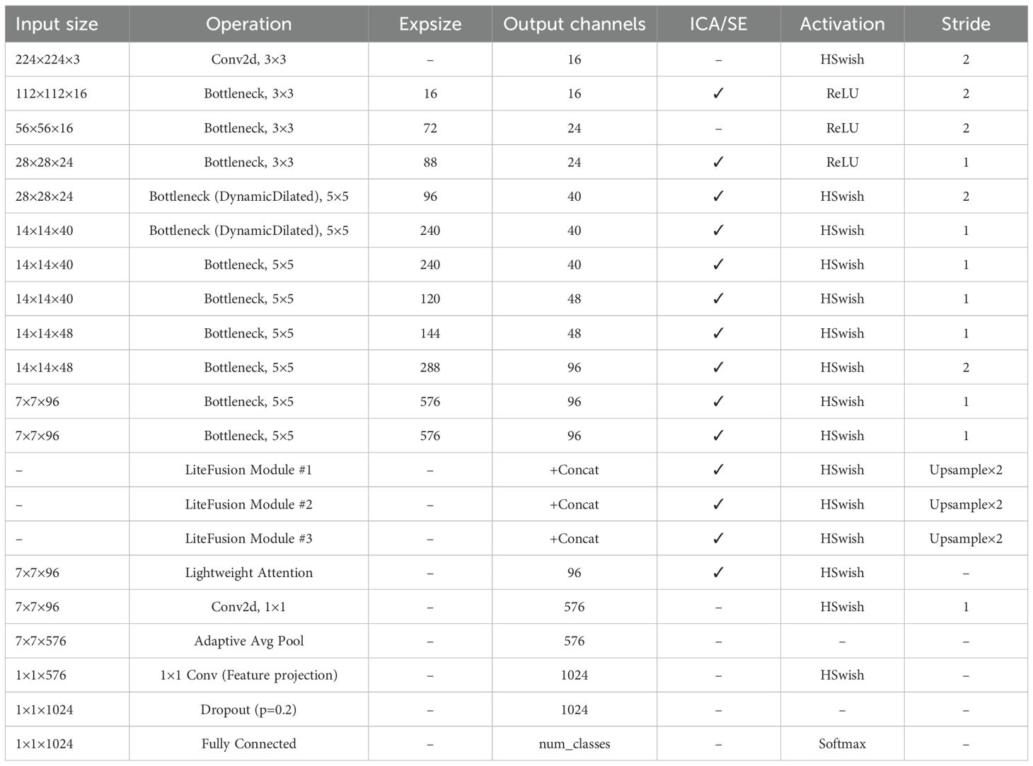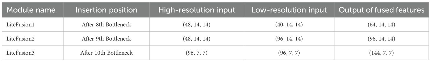 To extract information from high-resolution shallow features, the module Lite Fusion is inserted after layers 8, 9, and 10 of the Inverted Residual Bottleneck. These features are channel-enhanced by the SE attention mechanism, downsampled by a 1×1 convolution, and then concatenated with the deeper features of the current layer. The LiteFusion module facilitates cross-layer feature fusion, which effectively addresses the problem of information degradation across network layers. As a result, it substantially enhances the model’s capability to capture fine-grained features, thus enabling the network to more accurately localize and classify small lesions (Chen et al., 2018) (Lin et al., 2017).