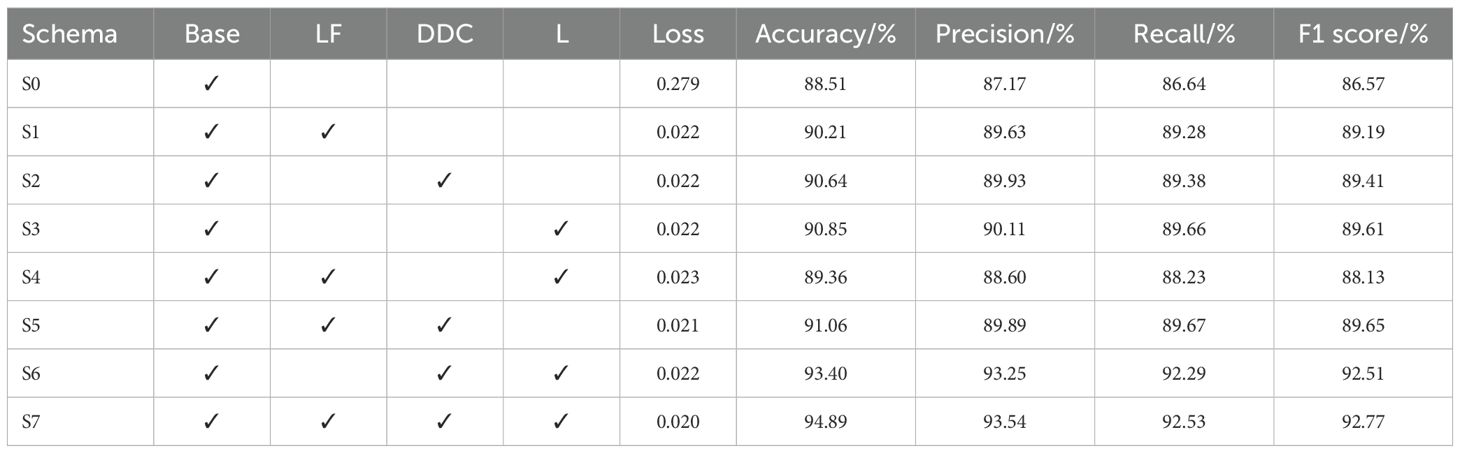 This article evaluates the performance of multi-module combinations to further analyze the synergies between various modules. By incorporating the LF and LA modules, S4 (S0 + LF + LA) improves accuracy to 89.36%, the F1 score to 88.13%, and reduces the loss value to 0.023. The above results show that there is still room for development in this combination’s feature extraction capabilities. When the LF and DDC modules are combined in S5 (S0 + LF + DDC), the accuracy increases to 91.06%, the F1 score improves to 89.65%, and the loss value drops to 0.021. This demonstrates that this combination can effectively enhance the model’s adaptability to the disease area. S6 (S0 + DDC + LA) combines the DDC and LA modules and achieves significant improvement in most metrics, with 93.40% accuracy, 92.51% F1 score and a loss value of 0.022. This suggests that DDC and LA have a strong complementary effect that can help improve the model’s feature extraction capability. Based on the S6 scheme, S7 (S0 + LF + DDC + LA) adds the LF module. The outcomes of the studies demonstrate that this plan performed the best across the board, with an accuracy of 94.89%, an F1 score of 92.77%, and a loss value of 0.020. This indicates that the integration of all three modules can improve classification performance, reduce the loss value, and significantly enhance the ability to detect potato leaf disease.
