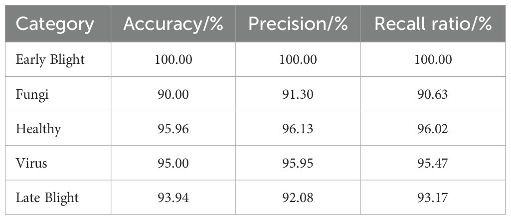 For disease control, high precision in disease detection tasks means that the model is less likely to generate false alarms when predicting a specific disease. This is of symbolic significance, as it indicates that fewer healthy leaves are incorrectly recognized as infected.
