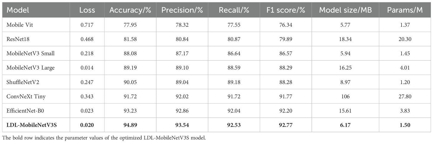 The aim of this research was to undertake a systematic comparative experiments to assess the efficacy of the proposed LDL-MobileNetV3S model in potato leaf disease detection tasks. This model was compared side by side with popular lightweight and medium complexity convolutional neural network architectures, such as ResNet18 (He et al., 2016), MobileVit (Mehta and Rastegari, 2021), MobileNetV3 (small and large versions), ShuffleNetV2 (Ma et al., 2018), ConvNeXt Tiny (Liu et al., 2022b) and EfficientNet-B0 (Tan and Le, 2019). Each model was trained using the same preprocessing procedure and training strategy on a consistent dataset. Performance metrics such as Loss, Accuracy, Precision, Recall, F1 Score, Model Size, and Parameters were evaluated on the test set. Table 7 presents the findings from the contrasting studies.