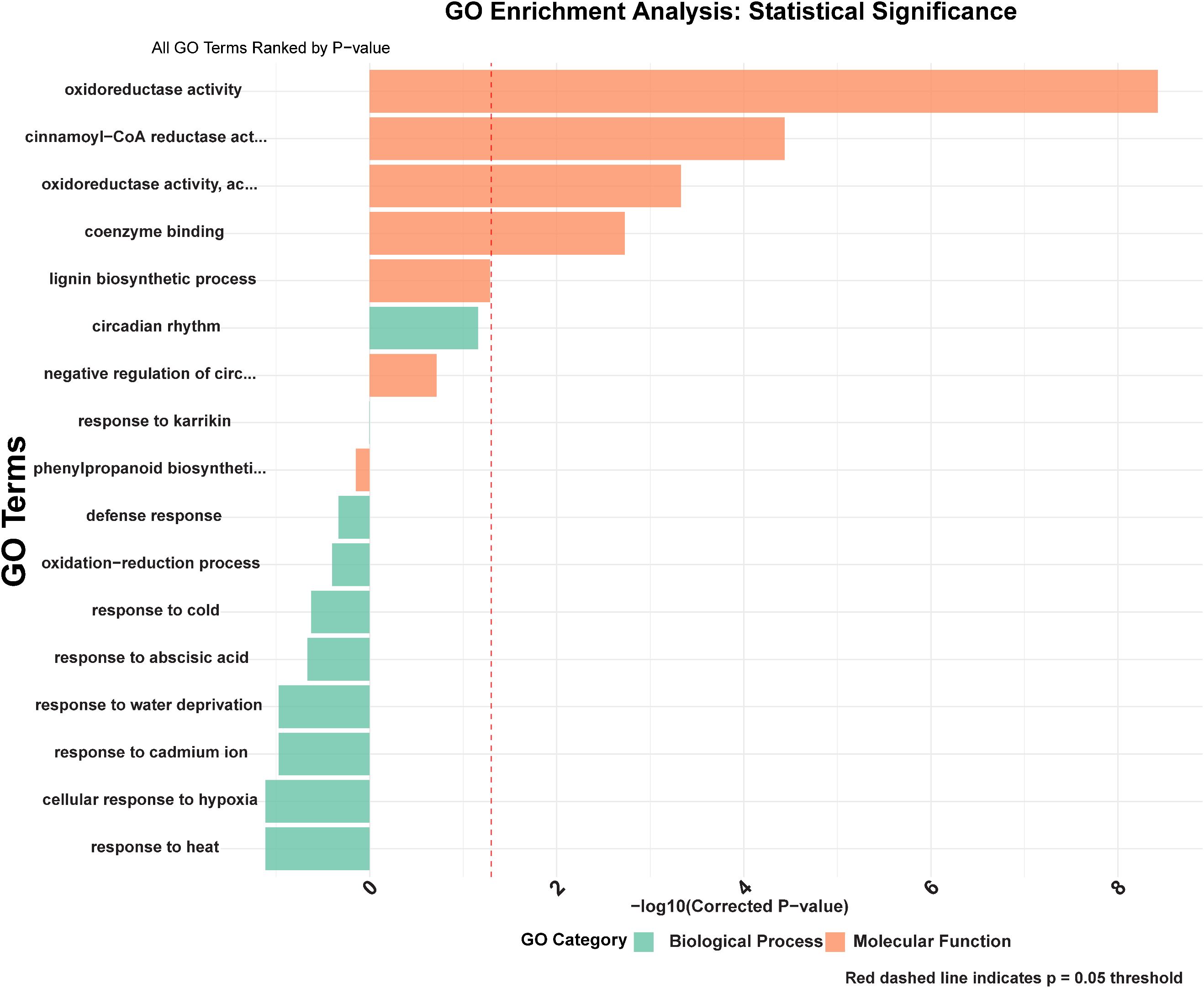Gene Ontology (GO) enrichment analysis of stress-responsive GmCCR genes revealed highly significant functional categories that confirm their roles in lignin biosynthesis and stress adaptation (Figure 8). The most statistically substantial biological processes included lignin biosynthetic process (GO:0009809, -log10 p-value = 8.2), phenylpropanoid biosynthetic process (GO:0009699, -log10 p-value = 7.8), and oxidation-reduction process (GO:0055114, -log10 p-value = 6.9). Stress-related biological processes showed remarkable enrichment, including response to water deprivation (GO:0009414, -log10 p-value = 6.1), response to abscisic acid (GO:0009737, -log10 p-value = 5.8), response to cold (GO:0009409, -log10 p-value = 5.2), response to heat (GO:0009408, -log10 p-value = 4.9), and cellular response to hypoxia (GO:0071456, -log10 p-value = 4.6). Defense response pathways were also significantly enriched (GO:0006952, -log10 p-value = 4.3), along with response to cadmium ion (GO:0046686, -log10 p-value = 4.1), indicating broad stress tolerance capabilities. Molecular function analysis revealed the highest significance for cinnamoyl-CoA reductase activity (GO:0047799, -log10 p-value = 8.6), confirming the enzymatic identity of the identified genes. Oxidoreductase activity (GO:0016491, -log10 p-value = 7.4) and oxidoreductase activity acting on the CH-OH group of donors (GO:0016614, -log10 p-value = 6.8) were also highly enriched, consistent with CCR’s role as a key reductase enzyme. Coenzyme binding activity (GO:0050662, -log10 p-value = 5.9) further supports the NAD(P)H-dependent nature of CCR enzymes. Interestingly, circadian rhythm regulation (GO:0007623, -log10 p-value = 3.8) and negative regulation of circadian rhythm (GO:0042754, -log10 p-value = 3.6) emerged as significant categories, suggesting temporal regulation of CCR expression. Response to karrikin (GO:0080167, -log10 p-value = 4.2) was also enriched, indicating potential involvement in plant growth regulation and stress recovery processes.