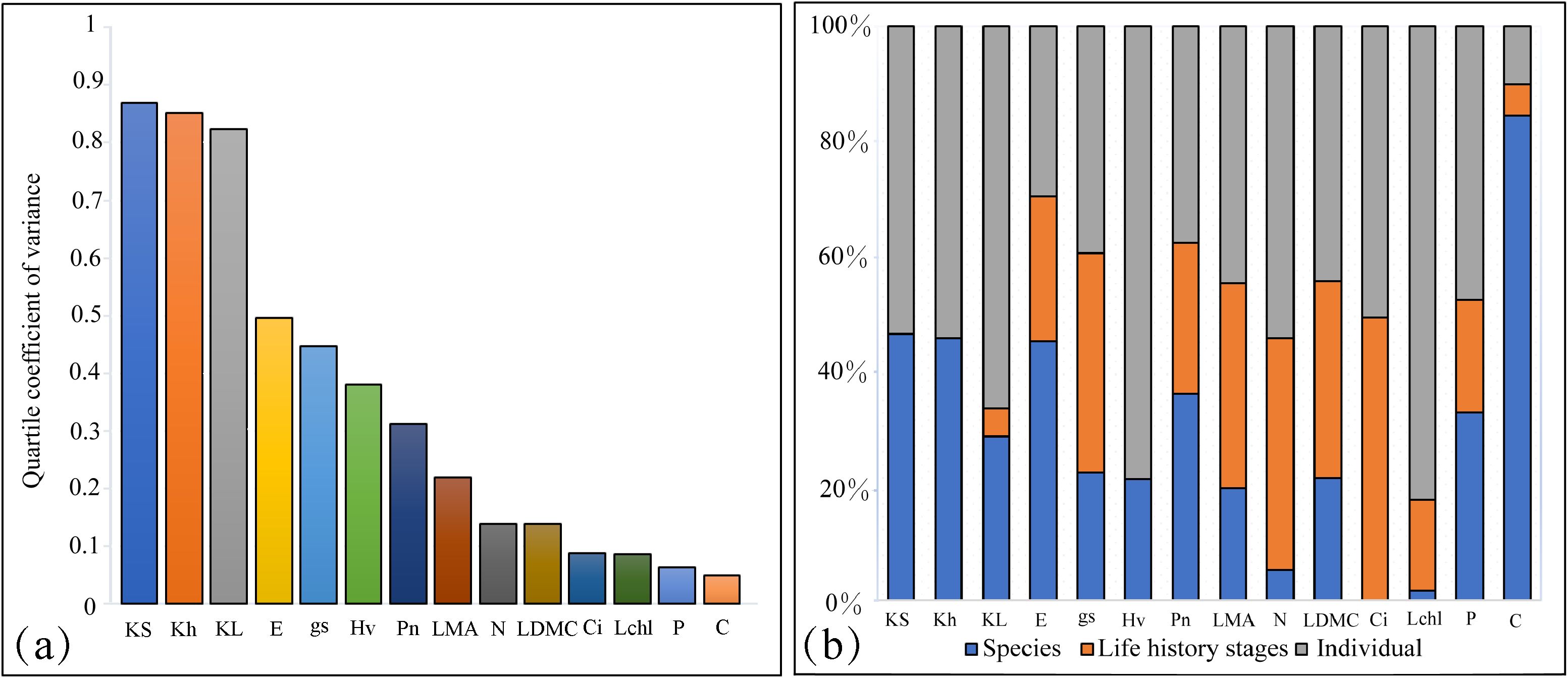 Figure 2. Variation and variance decomposition of tree functional traits across different life history stages. (a) Variation in different functional traits. (b) Variance decomposition of different functional traits. Percentages indicate the proportion of variance explained by each factor; values below 0.1% are displayed as 0. Trait abbreviations are consistent with those defined in Figure 1.