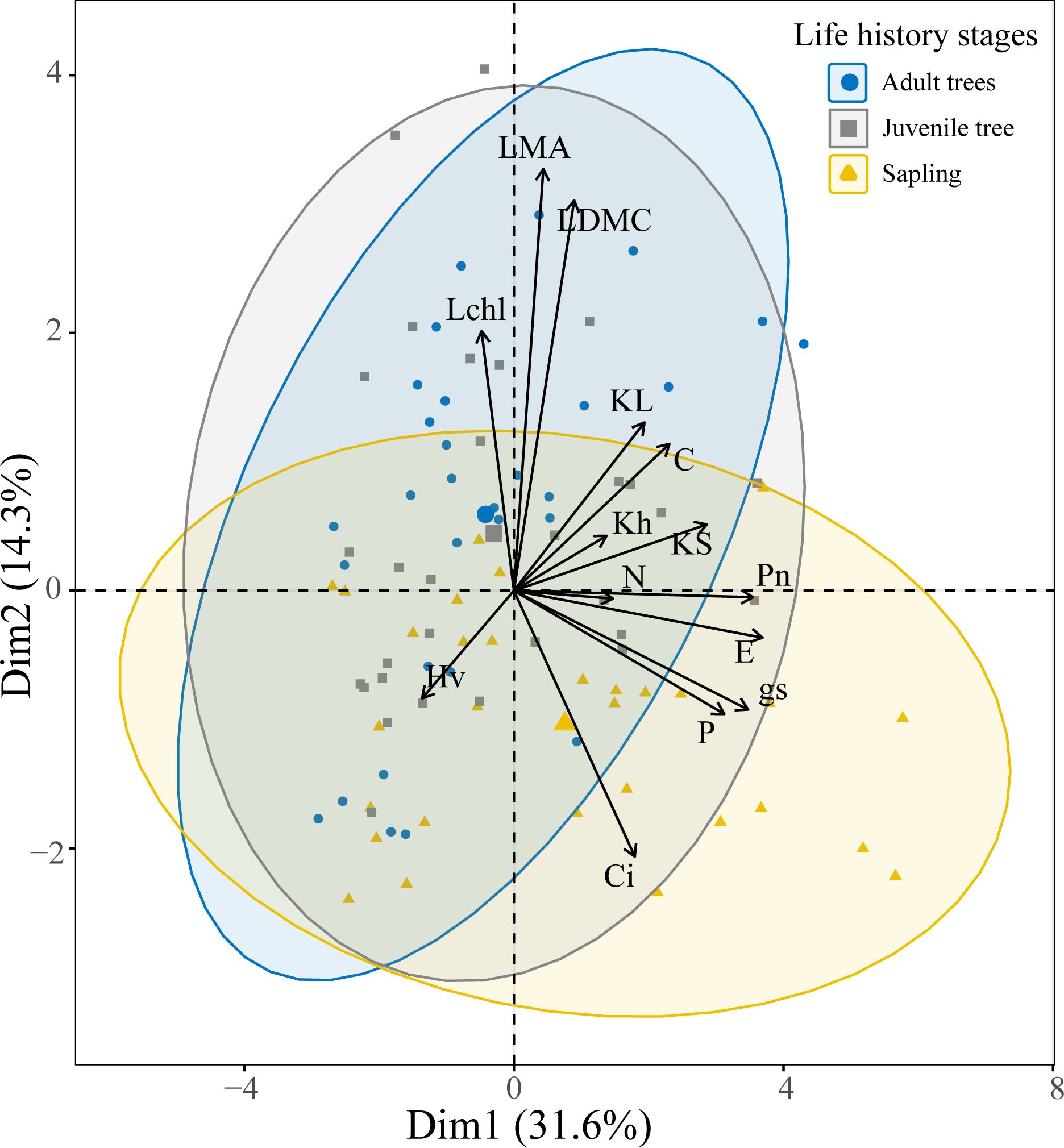 Figure 3. Principal component analysis of tree functional traits across different life history stages. Traits are abbreviated as detailed in Figure 1.