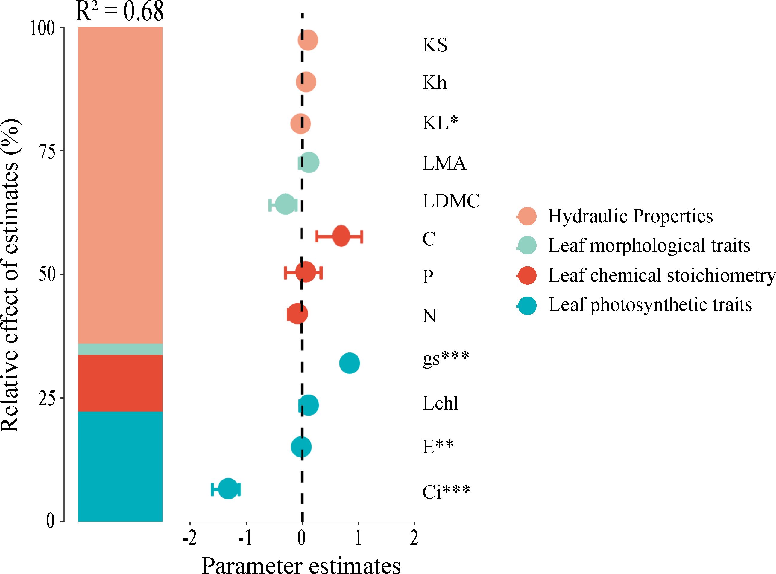 A mixed-effects model was employed to analyze the relative importance of hydraulic traits, leaf morphological traits, leaf chemical traits, and leaf chemical stoichiometry in predicting net photosynthetic efficiency. The model incorporated all predictors and demonstrated high explanatory power with a coefficient of determination (R²) of 0.68, indicating that the predictors within the model adequately explain the variance in the dependent variable. The results revealed that hydraulic traits, leaf morphological traits, leaf chemical stoichiometry, and leaf photosynthetic traits accounted for 59.28%, 0.27%, 15.92%, and 24.53% of the variation in net photosynthetic rate, respectively. This finding highlights that hydraulic traits are the primary factors influencing net photosynthetic rate, while leaf morphological traits have a minimal impact (Figure 4).