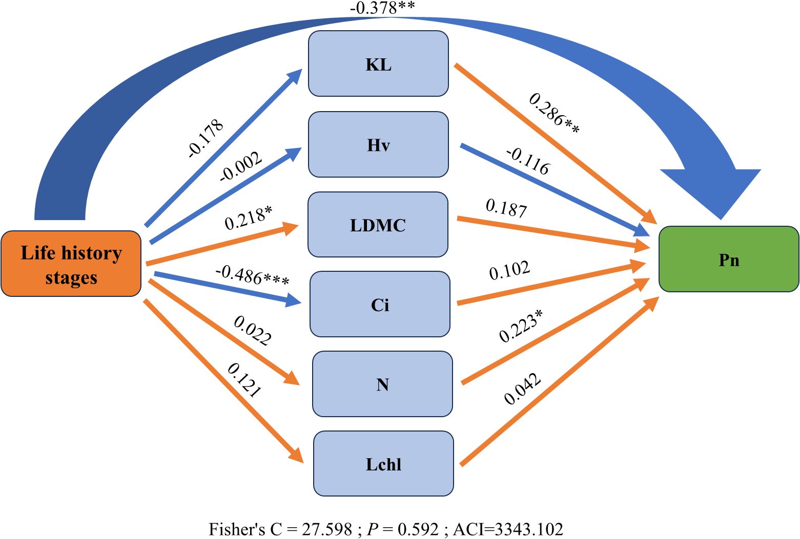 Figure 5. Relationships between functional traits and net photosynthetic rate (Pn) across life history stages. Orange and blue lines represent positive and negative correlations, respectively. Significance levels are indicated as *P < 0.05, **P < 0.01, ***P < 0.001. Abbreviations are consistent with Figure 1.