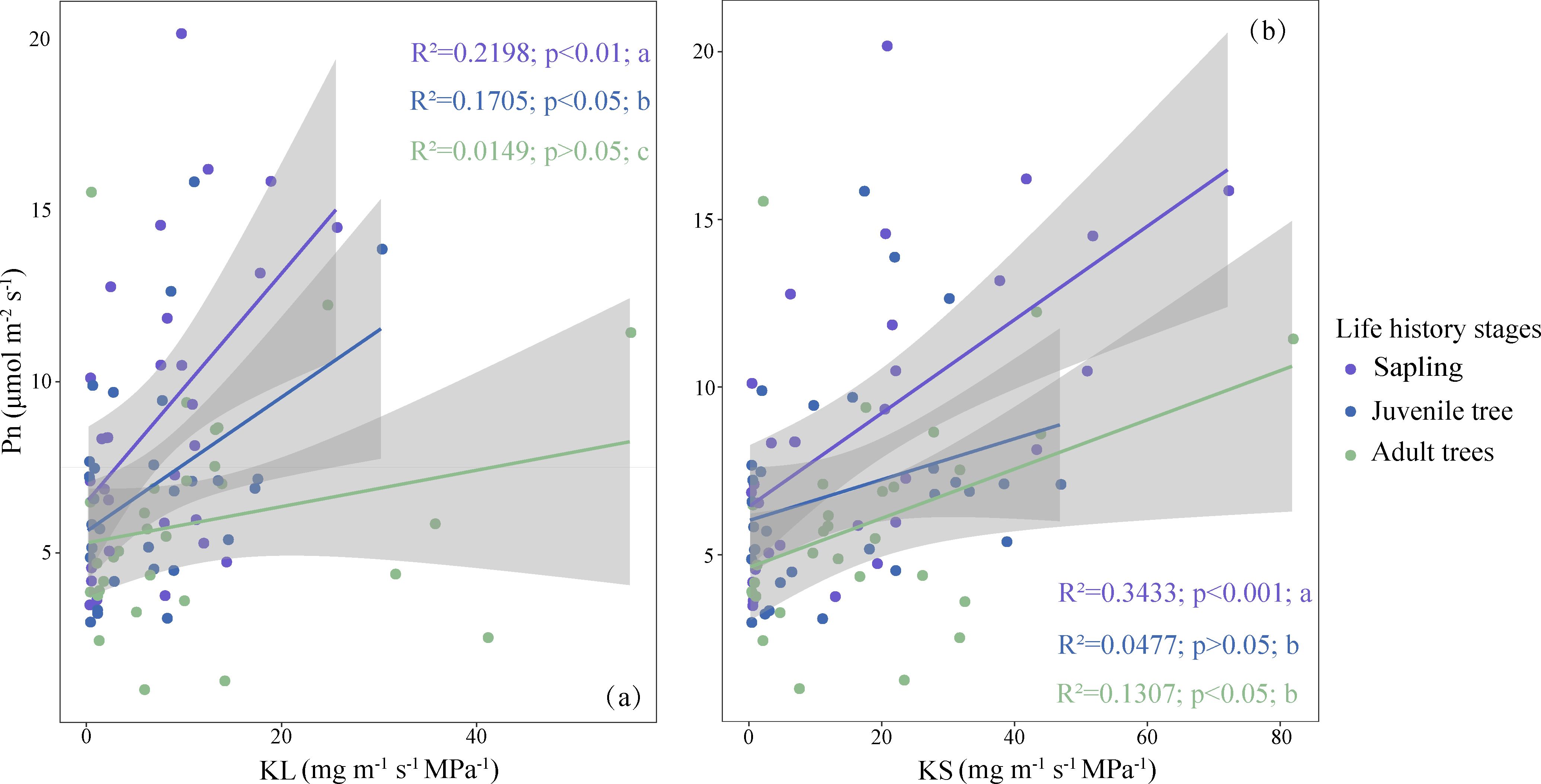 Figure 6. Coordination between net photosynthetic rate (Pn) and water use efficiency across life history stages. (a) Coordination between leaf specific hydraulic conductivity (KL) and net photosynthetic rate (Pn). (b) Coordination between sapwood specific hydraulic conductivity (KS) and net photosynthetic rate (Pn). Different lowercase letters denote significant differences in regression slopes among groups. Trait abbreviations are as defined in Figure 1.