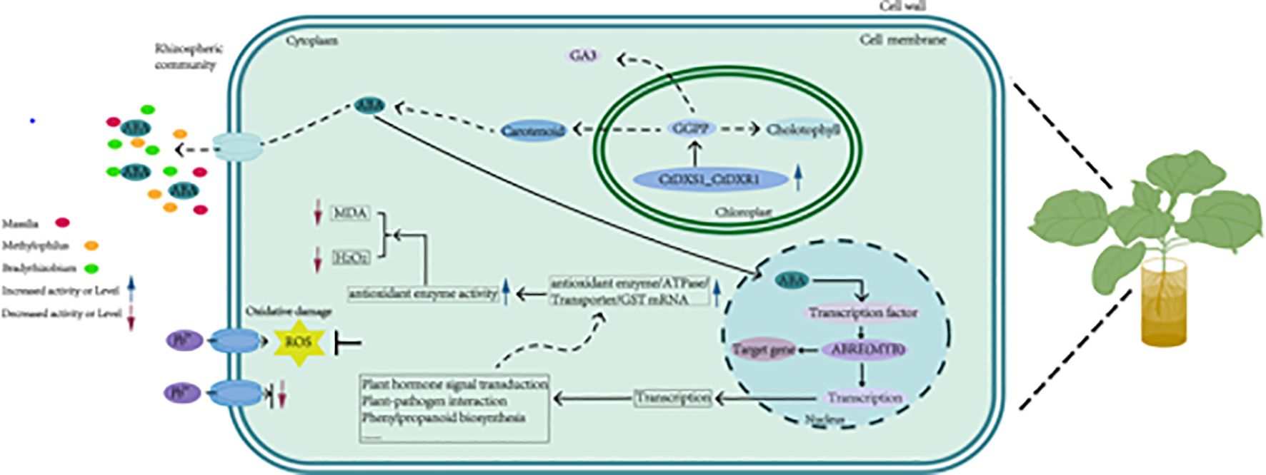 Derived from the literature and our results, it is important to summarize the multifaceted roles of ABA in response to various heavy metals in plants. These roles include: (1) Modulating the production of endogenous plant hormones and signaling pathways (Guo et al., 2021; Ma et al., 2024; Zhang et al., 2025). (2) Influencing the expression of metal transporter genes, thereby facilitating transport heavy metals intracellularly or detoxify them (Kim et al., 2022; Janicka-Russak and Kabała, 2012; Zhao et al., 2023; Dhara and Raichaudhuri, 2021; Ma et al., 2021). (3) Regulating downstream signaling that directly or indirectly enhances antioxidant enzyme activities, contributing to cellular detoxification (Jalmi et al., 2018; Tian et al., 2023). (4) Remodeling the rhizosphere microorganisms to improve adaptation to abiotic stress (Tang et al., 2022).
