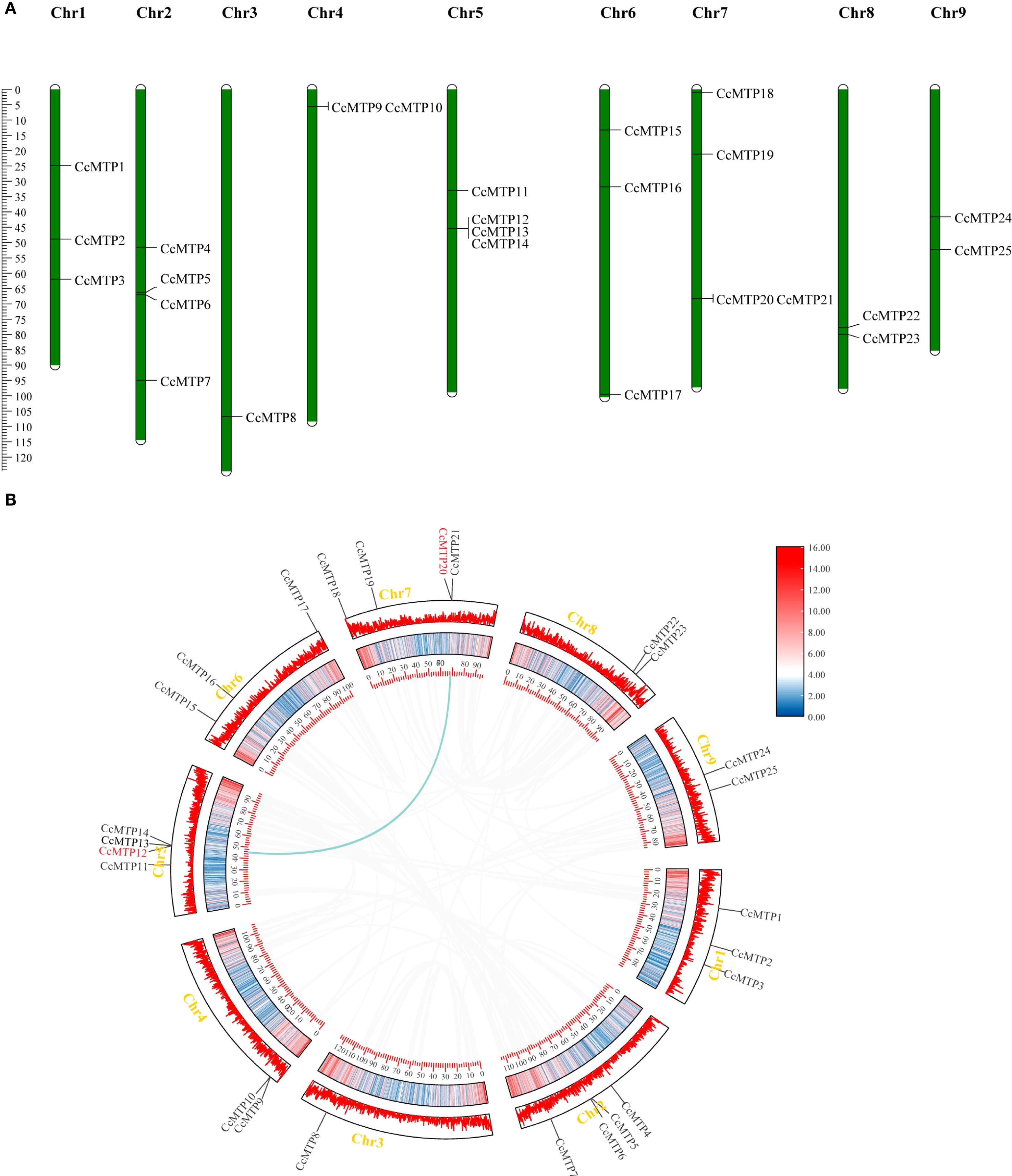 Panel A shows nine chromosomes labeled Chr1 to Chr9, each containing several markers denoted as CcMTP, with positions marked on a vertical scale. Panel B displays a circular representation of these chromosomes, highlighting relationships and expression levels with a gradient scale from red to blue.