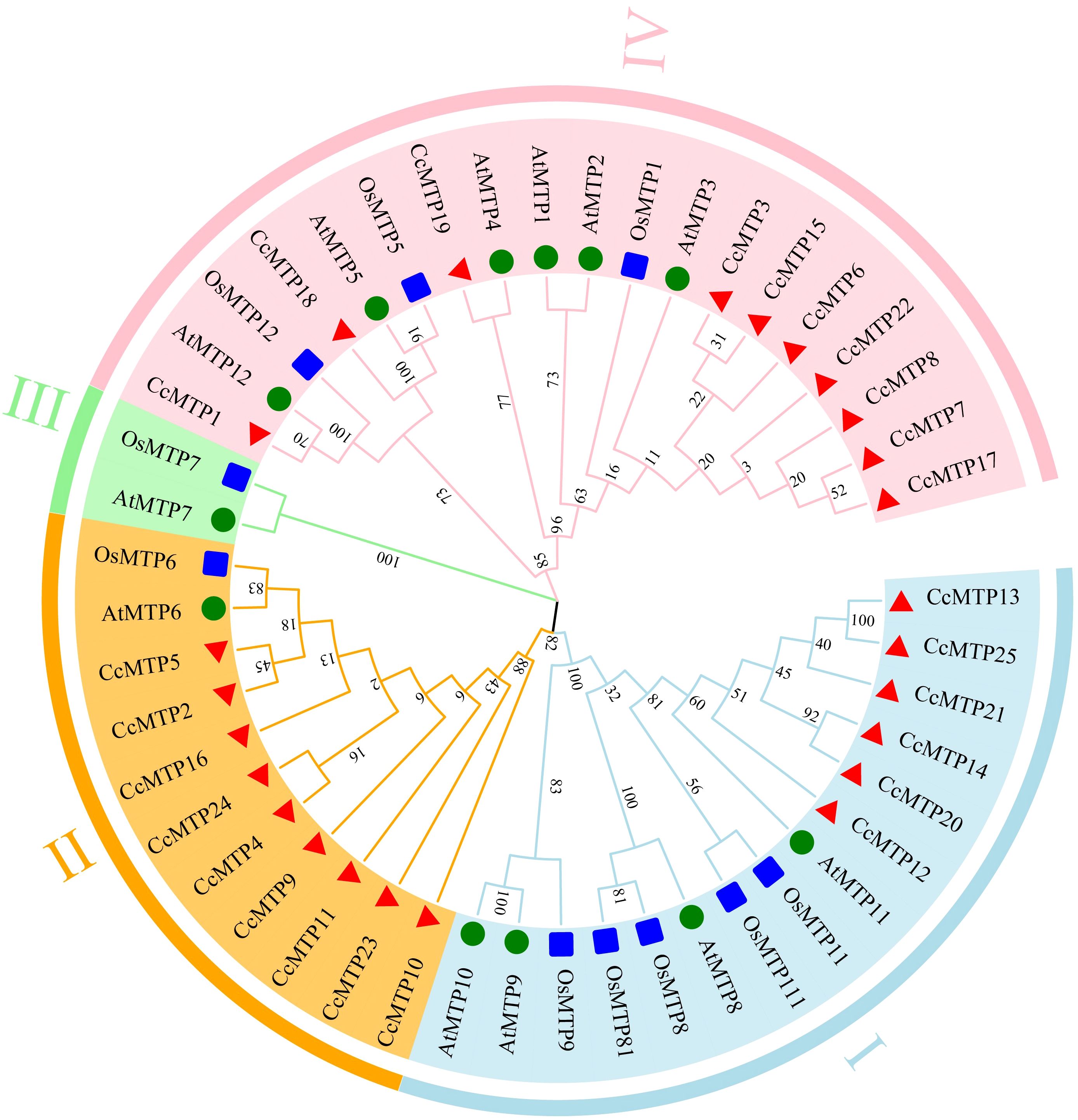 Circular phylogenetic tree depicting the evolutionary relationships among various MTP proteins. Sections are color-coded: pink (IV), blue (I), green (III), and orange (II). Triangles, squares, and circles indicate different species. Branches show bootstrap values, reflecting confidence in the relationships.