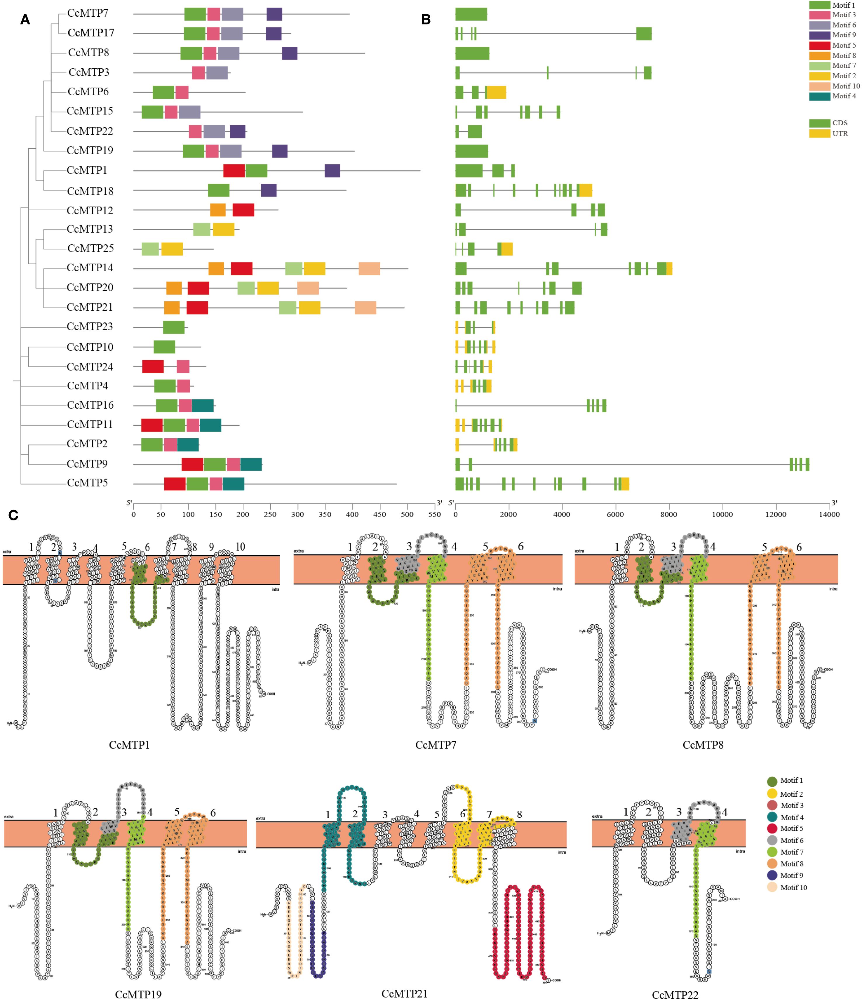 Figure 3. Annotation of the CcMTP gene family in C. chinensis including comprehensive analysis of conserved motifs, exon–intron organisation, and transmembrane helix (TM) architecture. (A) Phylogenetic analysis and motif characterisation of CcMTP gene family. Conserved motifs are distinguished by distinct colour coding across the phylogenetic tree. (B) Gene structures of CcMTPs. Exons, untranslated regions (UTRs), and introns are represented by yellow boxes, green boxes, and connecting lines, respectively. The dimensions of boxes and lines are proportional to the corresponding gene lengths. (C) Conserved motif arrangement across transmembrane helices (TMs). Transmembrane structures are labelled with black numbers, whereas distinct colour coding shows differently conserved motifs.