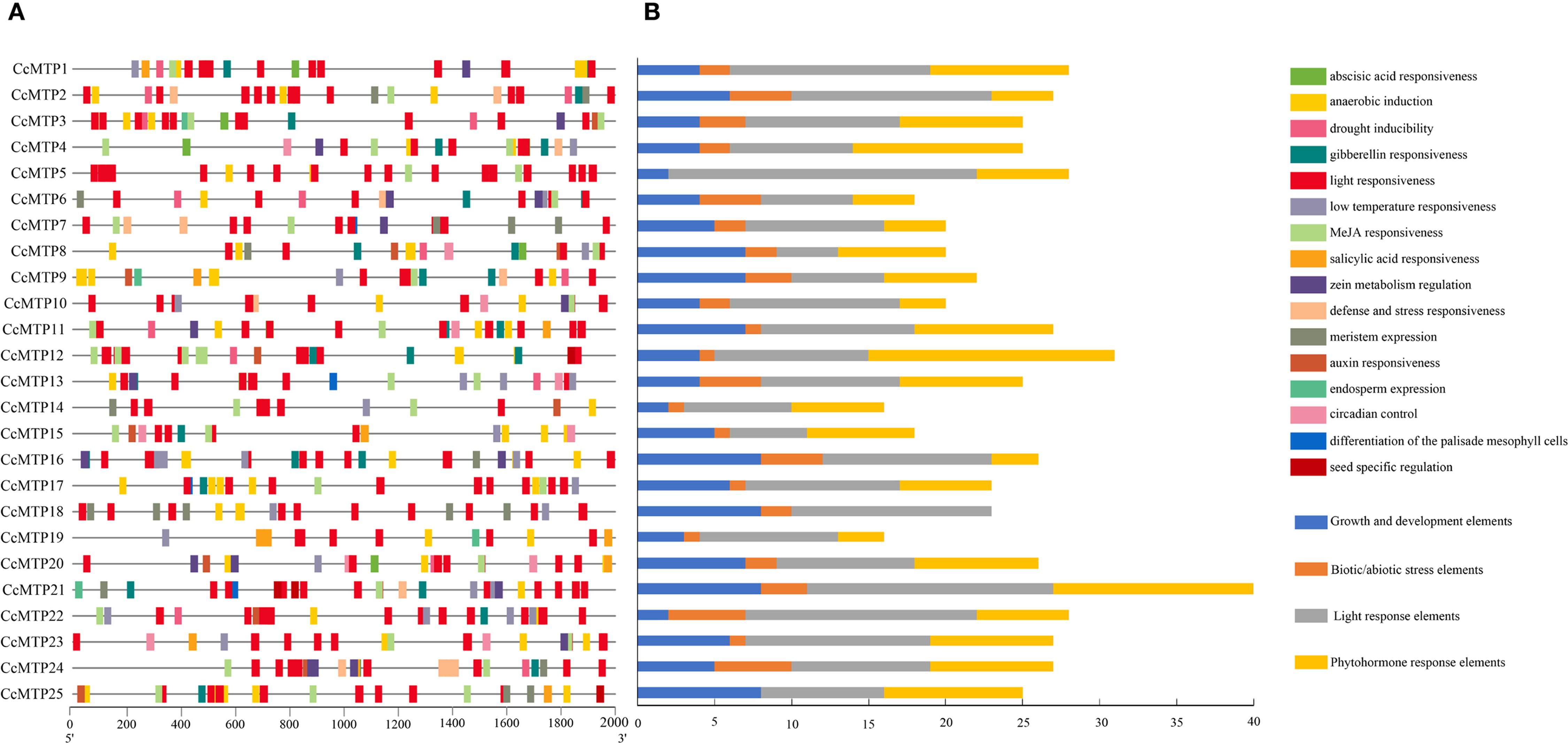 Figure 4. Cis-acting elements analysis of CcMTPs family promoters. (A) Distribution of cis-acting elements. (B) The statistics of cis-acting elements of each CcMTP gene.