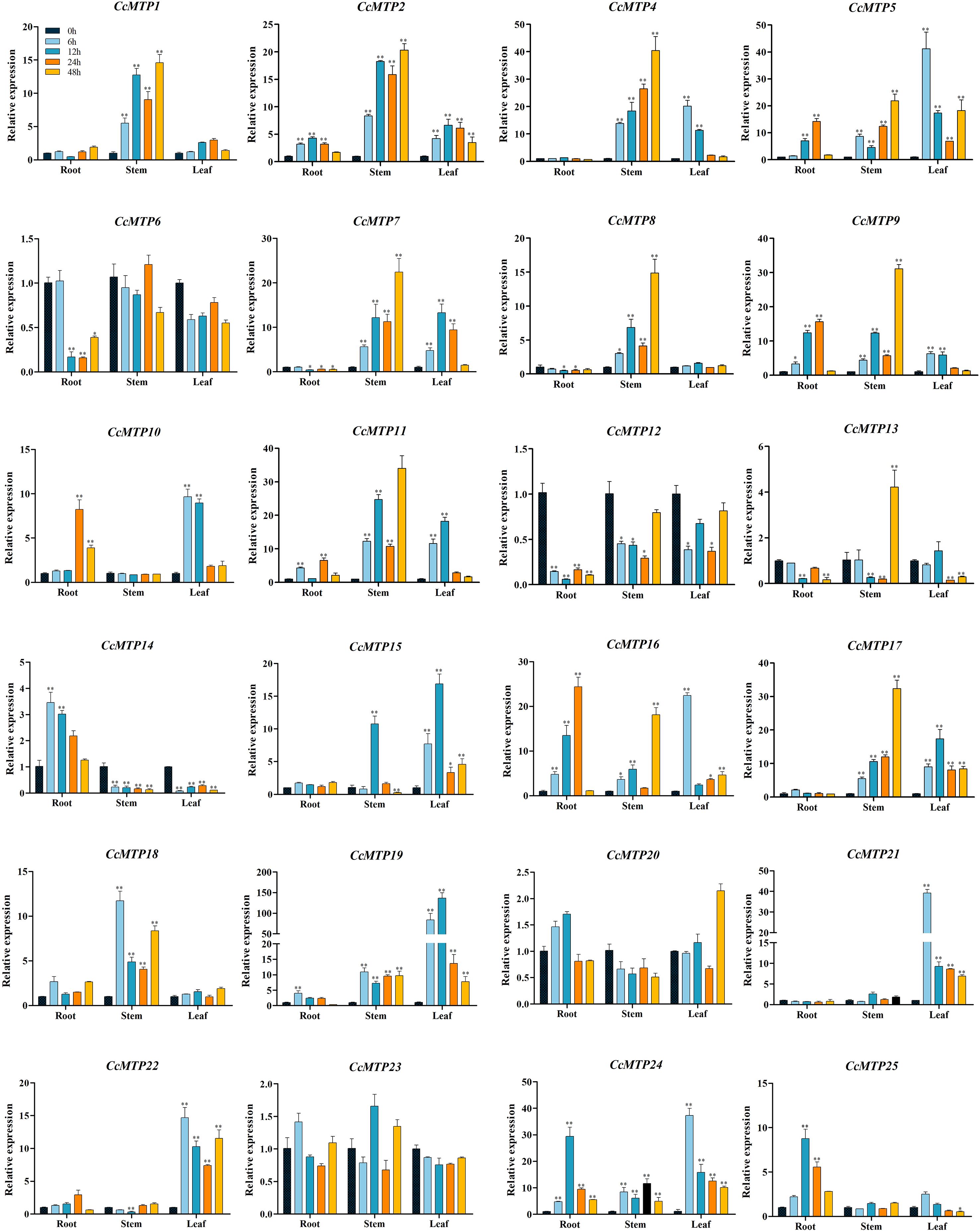 Bar charts showing the relative expression levels of various CcMTP genes across root, stem, and leaf tissues at different time points (0, 6, 12, 24, 48 hours), indicated by different colored bars. Each chart represents a different gene, labeled CcMTP1 through CcMTP25. Bars show variations in expression, with significant differences marked by asterisks.