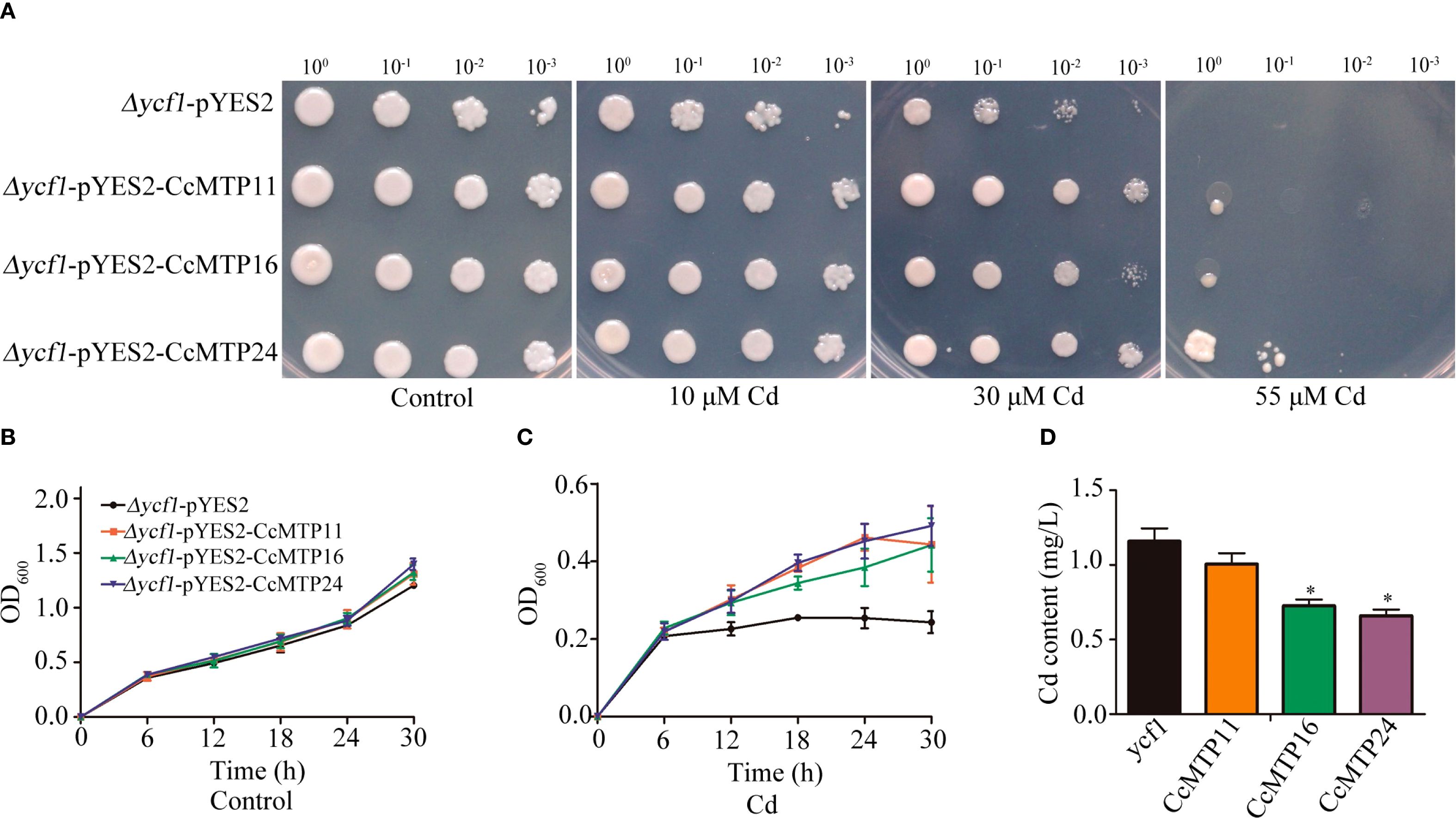 Figure 6. Functional analysis of CcMTP11, CcMTP16, and CcMTP24 in the yeast cells. (A) △ycf1 mutant harbouring empty vectors or recombinant plasmids encoding CcMTP11/CcMTP16/CcMTP24 were cultured on SGR-Ura solid medium supplemented with 0, 10, 30 or 55 µM Cd for 3 days. (B, C) Growth dynamics of yeast cells at different time intervals in the absence (B) or presence of CdCl₂ (C). Yeast cultures were adjusted to an OD₆₀₀ of 0.2, followed by the addition of CdCl₂ to achieve a final concentration of 35 µM in the medium. Samples were harvested and OD₆₀₀ was measured at 6-hour intervals thereafter. (D) The content of Cd in yeast cells. ycf1, CcMTP11, CcMTP16, and CcMTP24 represented △ycf1 mutant harbouring empty vectors or recombinant plasmids encoding CcMTP11, CcMTP16, and CcMTP24. Asterisks indicate significant differences from the control by one-way ANOVA and t-test followed by an independent-samples Dunnett’s post hoc test (*, p ≤ 0.05).