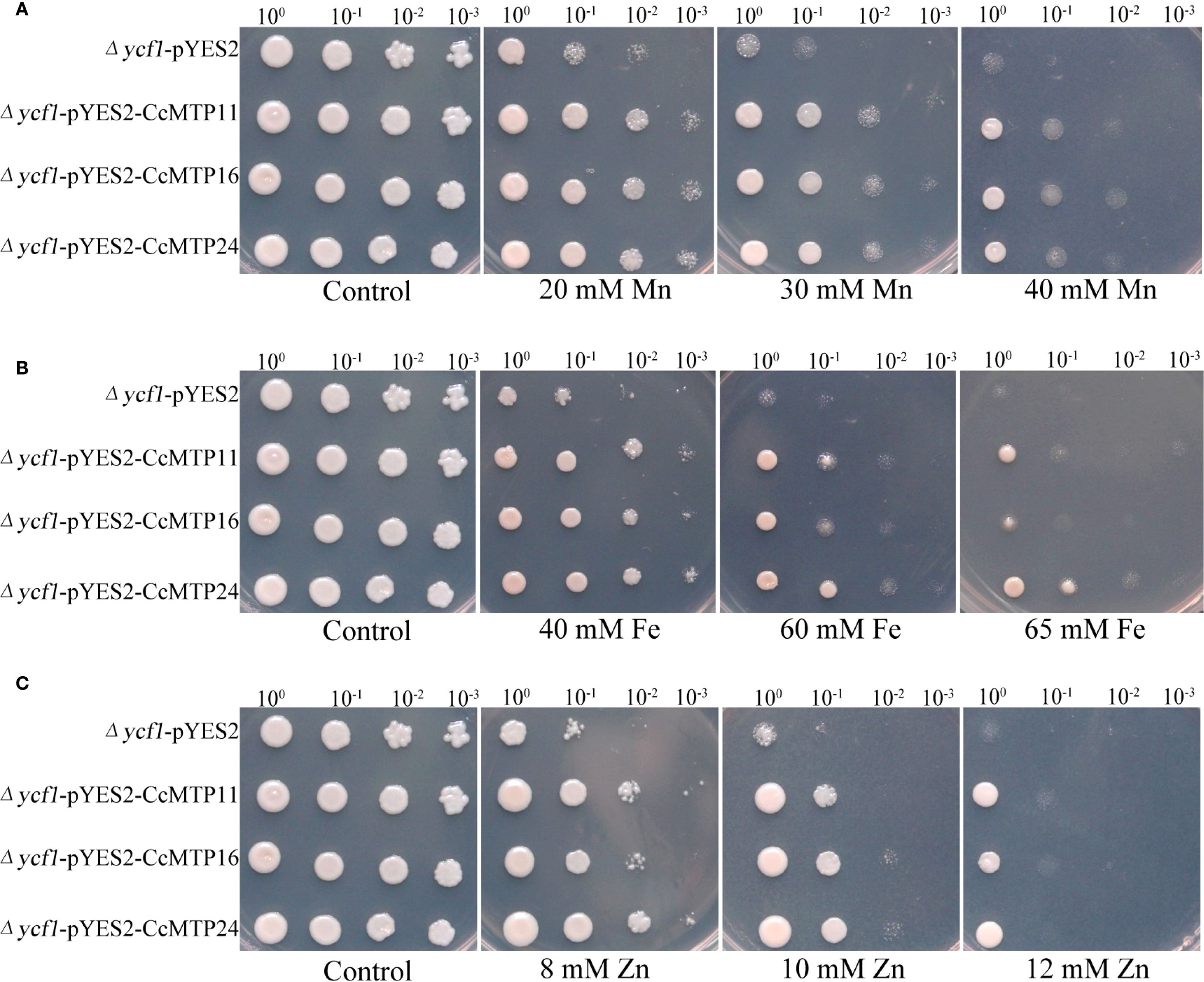 Figure 7. Heterologous expression-mediated tolerance of yeast to Mn, Zn, and Fe conferred by CcMTP11, CcMTP16, and CcMTP24. Yeast cells were subjected to transformation with either the empty vector pYES2 or CcMTP11, CcMTP16, and CcMTP24, then inoculated onto SGR-Ura solid medium amended with 0, 20, 30, 40 mM MnCl2 (A), 0, 40, 60, 65 mM FeSO4 (B); 0, 8, 10–12 mM ZnSO4 (C).