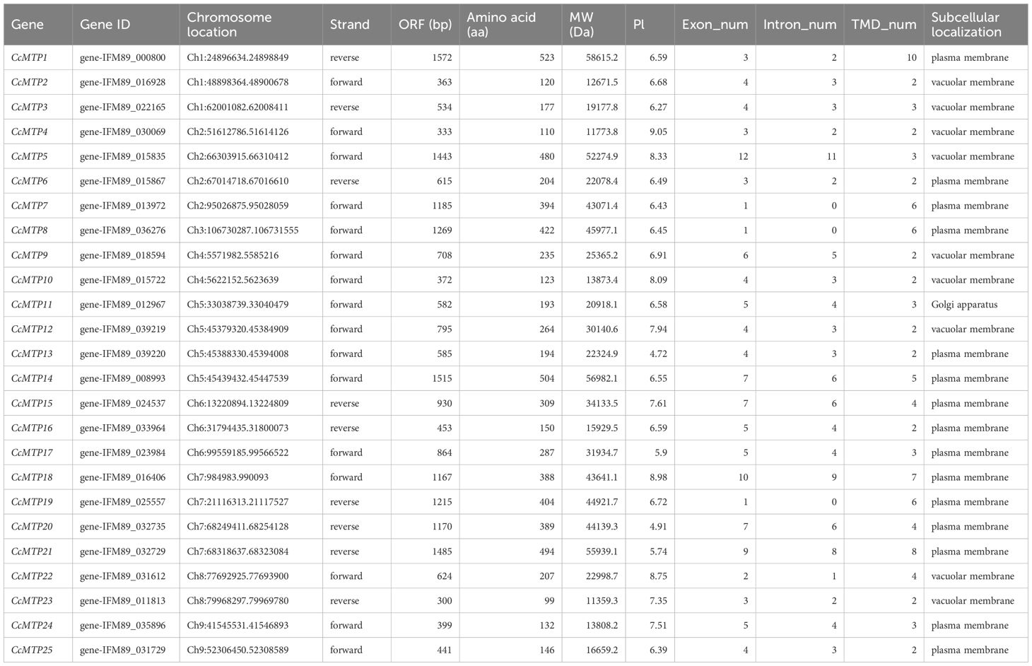 Table 1. Physicochemical characterisation and subcellular localisation profiling of 25 metal tolerance proteins (MTPs) identified in Coptis chinensis.