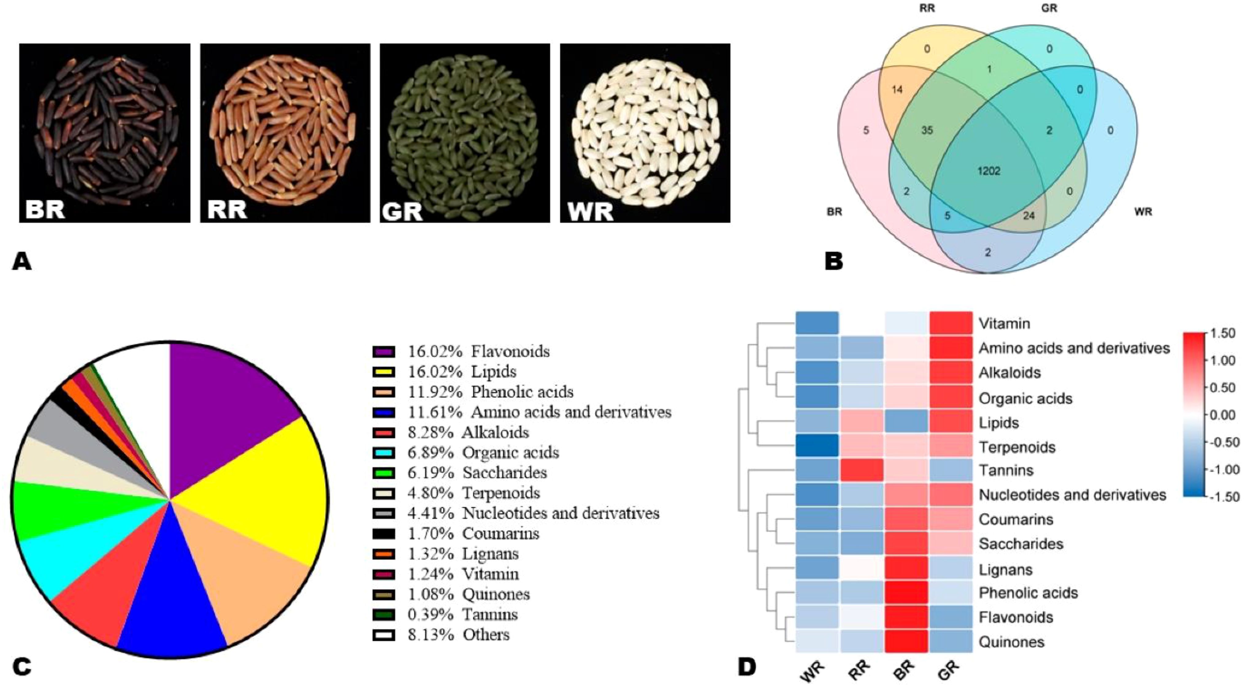Figure 2. The distinct colored rice grains (brown rice, red rice, green rice, and white rice) morphology and metabolic variations.