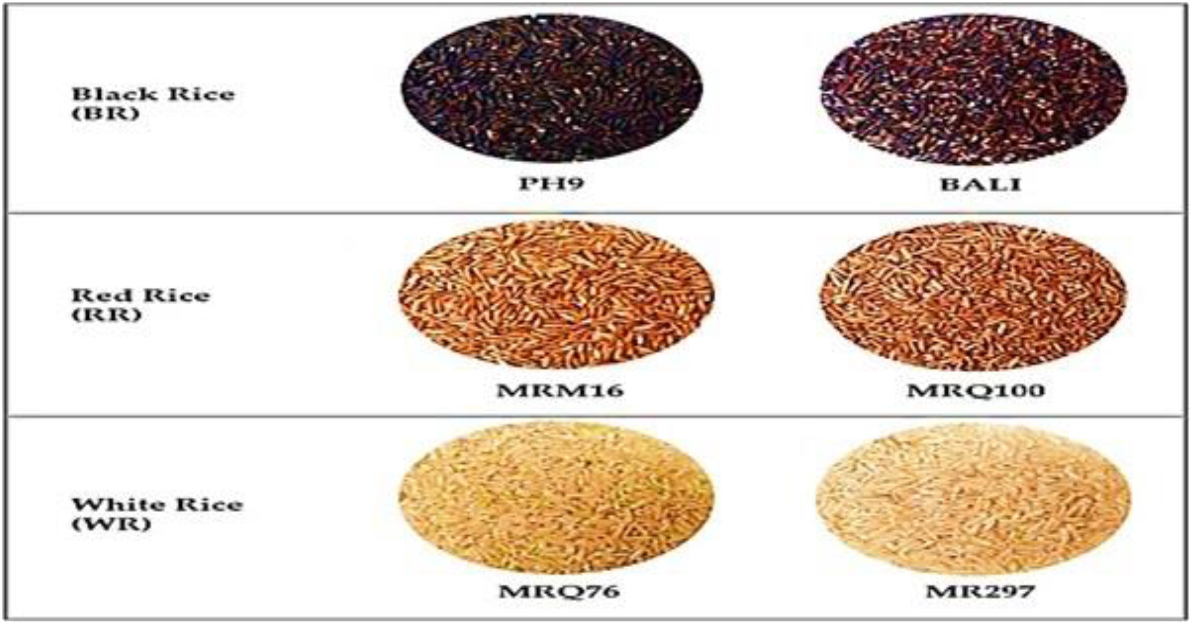 Total protein content, rice typically contains 7-9% protein by weight, depending on the variety and growing conditions, pigmented rice varieties are shown in Figure 3 (Fageria, 2007; Sew et al., 2023); white rice: around 7% protein (polished grains have lower protein content due to the removal of the bran and germ), brown rice; around 8-9% protein (higher due to the retention of the bran layer), and protein distribution; most rice proteins are found in the endosperm, with smaller amounts in the bran and germ.