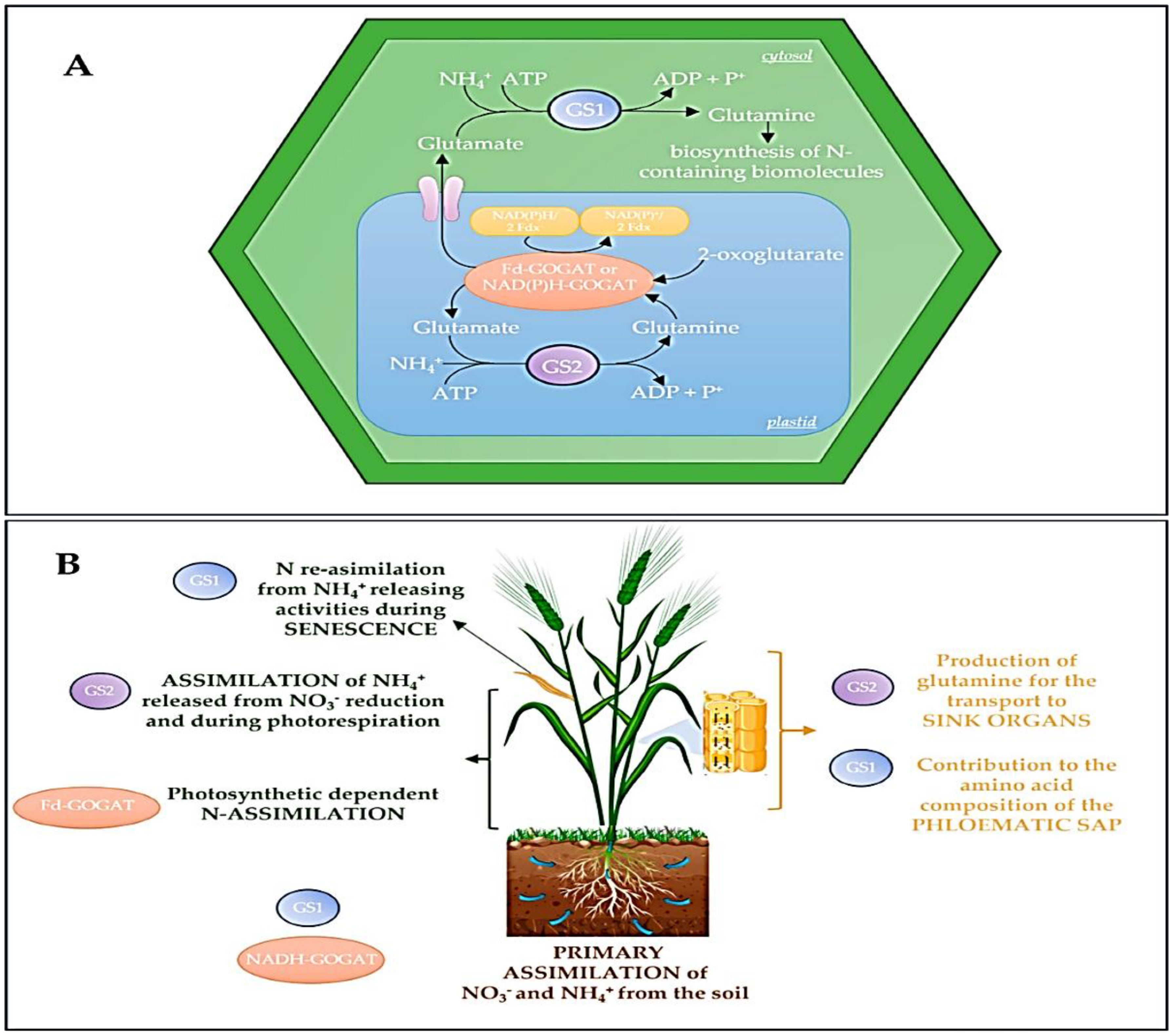 Figure 4. Maps the physical location of the GS-GOGAT cycle in plant cells and describes how the function of its enzymes is determined by their localization. (A) a diagram of where this metabolic cycle takes place inside a typical plant cell. (B) explains that the different versions (isoenzymes) of the GS and GOGAT enzymes have specialized roles based on their specific locations within the cell.