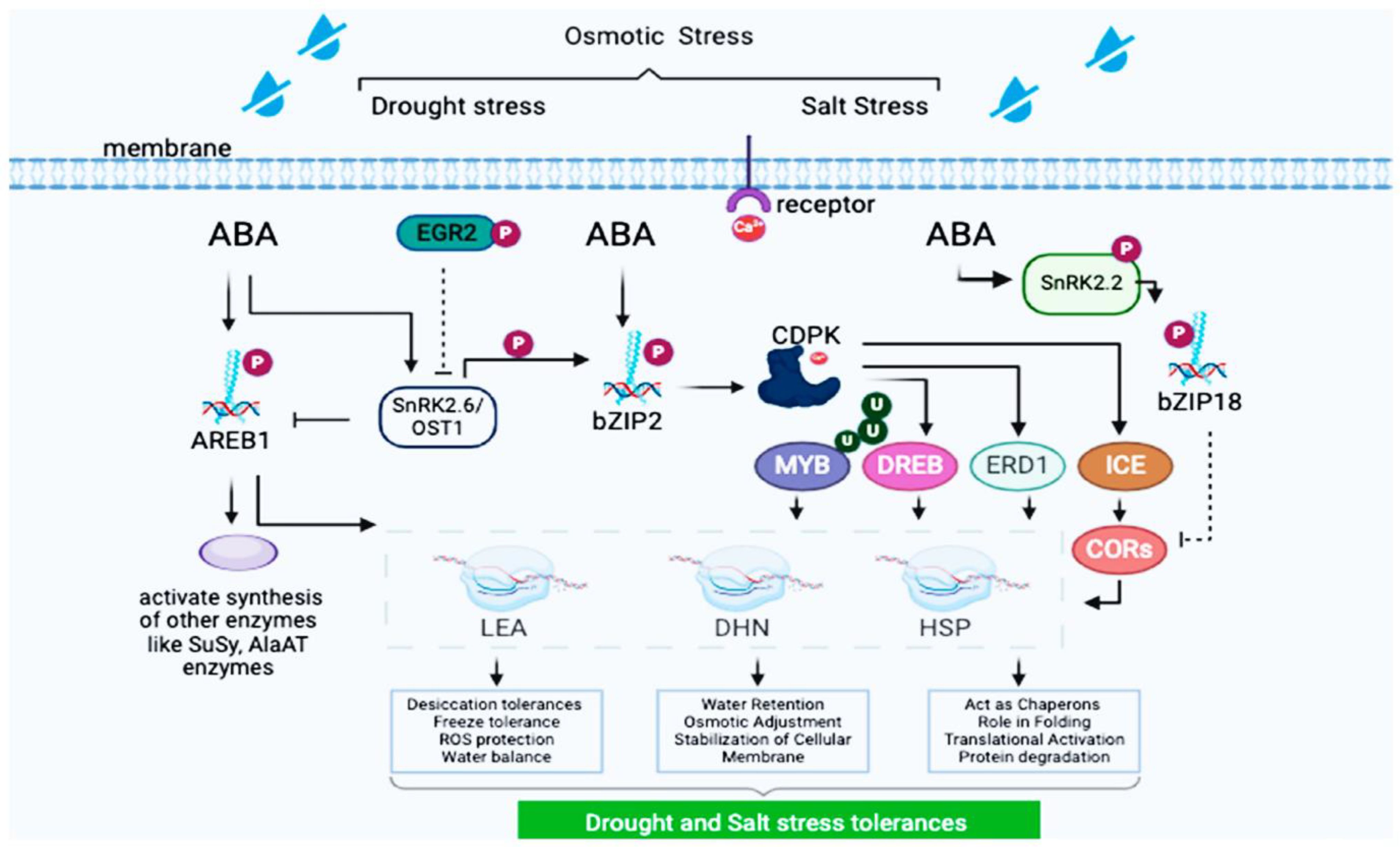 Figure 7. AREB1 and bZIP2-mediated gene networks in ABA-dependent drought and salt stress adaptation. The key differences between rice and barley were summarized as shown in Table 3.