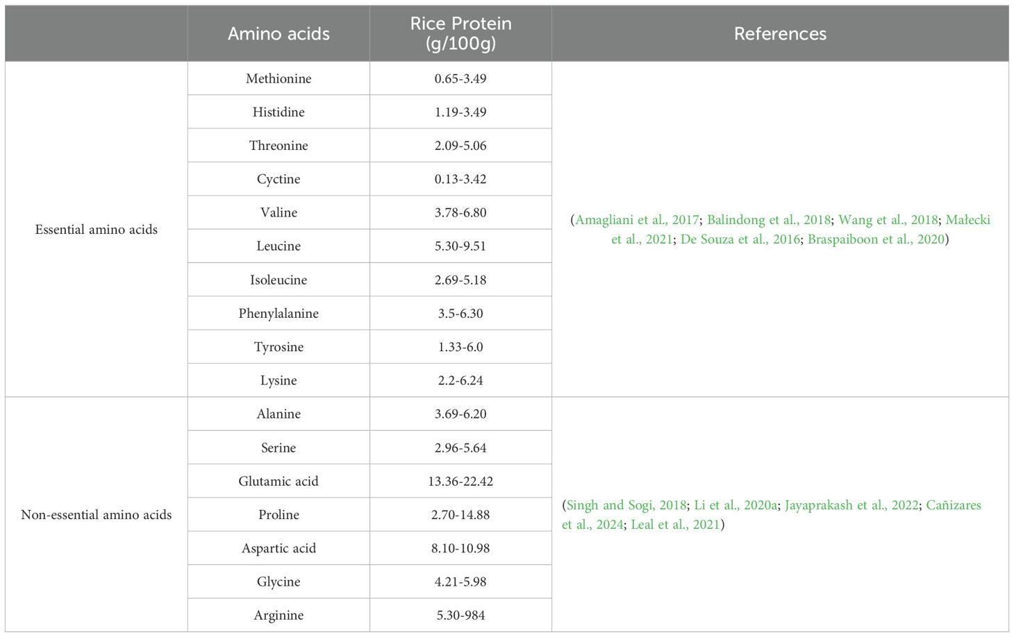 Rice amino acids are classified based on their solubility and functional properties (Table 1); glutelins: 60–80% of rice’s total protein composition is made up of the most prevalent storage proteins (Xinkang et al., 2023). They are highly digestible and contribute to the nutritional quality of rice. Prolamins are minor components in rice, making up 5-10% of total protein (Muench et al., 1999), they are less soluble and have limited nutritional value due to low lysin content, albumins and globulins; these water-and salt-soluble proteins are rich in essential amino acids and play a role in metabolic processes during seed development (Aragão et al., 2015).