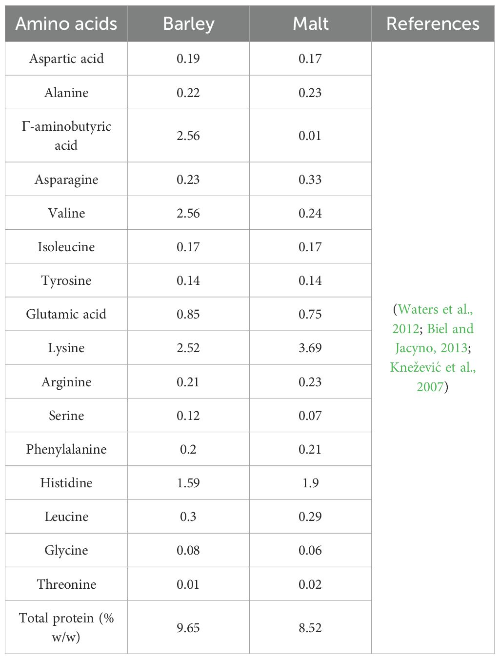 Barley grains typically contain 8–15% protein (dry weight basis), depending on genetic factors, environmental conditions, and agronomic practices. The protein fraction consists of four major groups based on solubility (Osborne classification): hordeins are the major storage proteins in barley, accounting for 35-50% of total protein. They are alcohol-soluble and contribute to the viscoelastic properties of barley dough (Shewry and Darlington, 2024), glutelins like rice, glutelins in barley are important for seed storage and nutritional quality, and both of albumins and globulins are essential amino acids and abundant in these proteins and play a role in stress responses and germination, for barley amino acids as shown in Table 2.