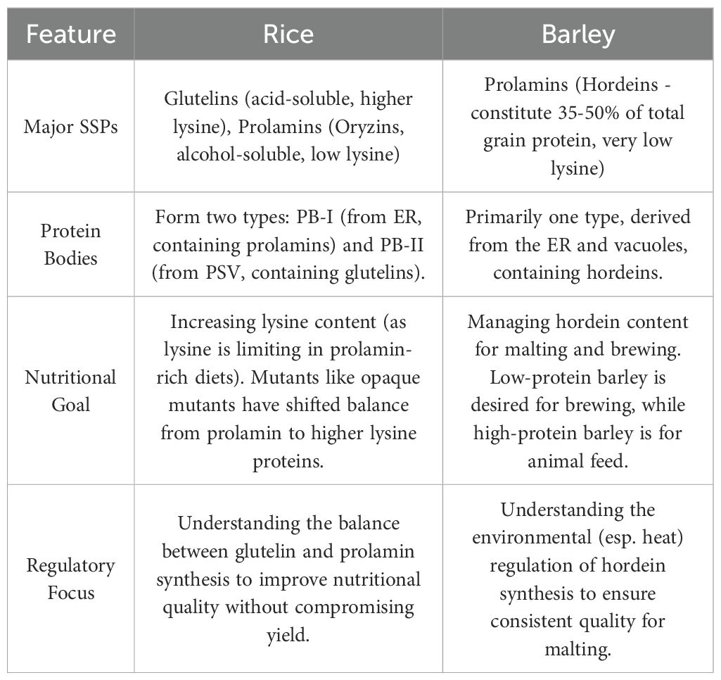 In conclusion, while both rice and barley utilize different storage proteins for seed storage, their nutritional and regulatory goals are shaped by their primary end uses. Rice’s protein composition is split between lysine-poor prolamins and lysine-rich glutelins, leading to a research focus on increasing overall lysine content to improve its nutritional quality for human consumption. In contrast, barley’s protein profile is dominated by lysine-deficient hordeins (prolamins), and its research is not focused on nutrition but rather on managing protein levels for specific industrial applications: low protein for optimal brewing and high protein for animal feed. Consequently, regulatory research for rice aims to balance protein synthesis to improve diet, while barley research seeks to understand environmental impacts on hordein levels to ensure consistent quality for the malting industry.