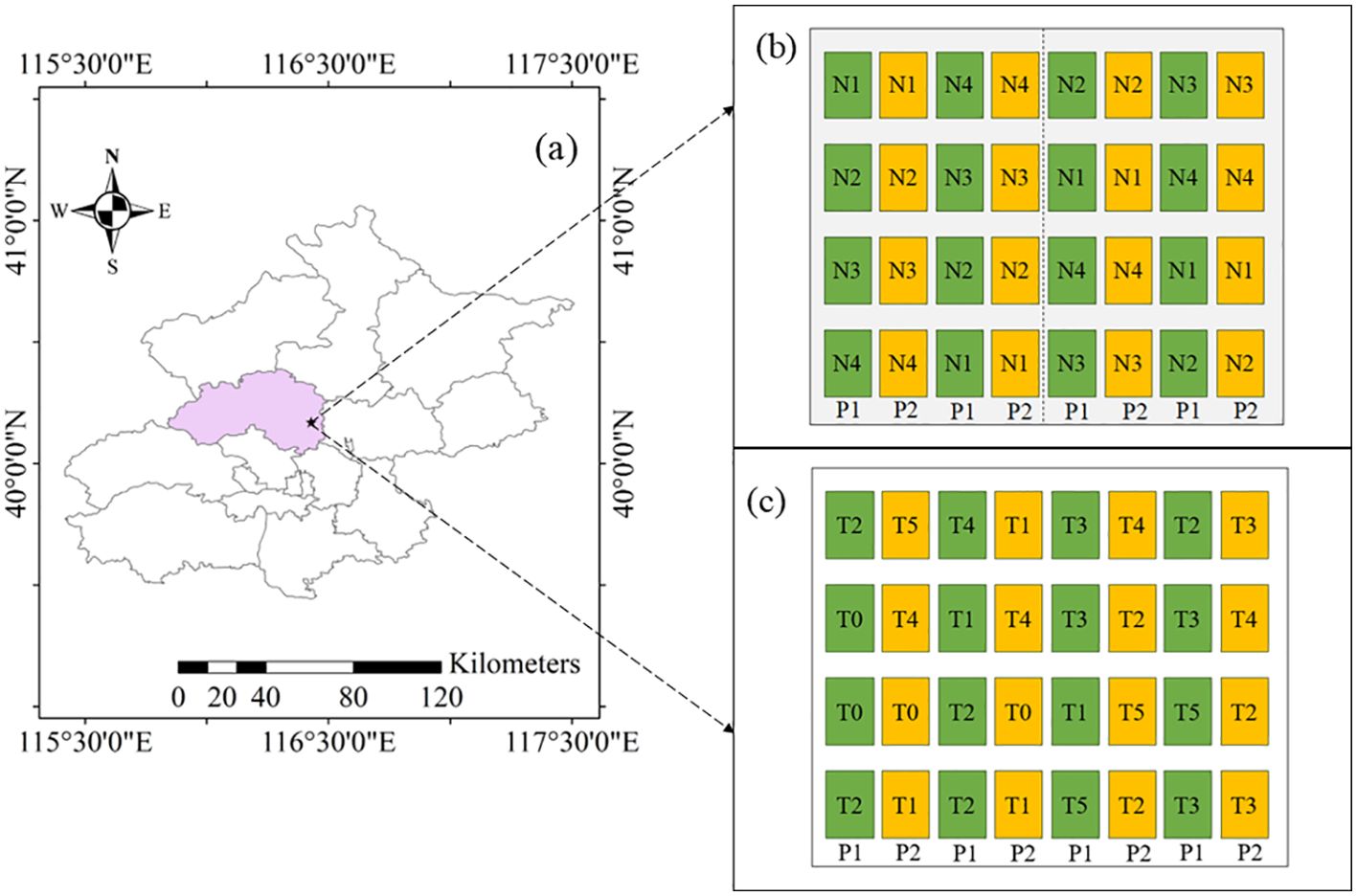 This study was implemented during 2015–2018 at the Xiaotangshan National Precision Agriculture Research Centre (40.17°N, 116.43°E), positioned on the outskirts of Beijing, China (Figure 1a), a site well-known for precision farming research. The local site, characterized with warm temperate and semi-humid climate with a continental monsoon pattern, features silt loam soil with 0–30-cm-layer properties with concentrations of NO3−-N (3.16–14.82 mg kg−¹), NH4+-N (8.12–14.52 mg kg−¹), organic matter (15.8–20.0 g kg−¹), available phosphorus (3.14–21.18 mg kg−¹) and exchangeable potassium (86.83–120.62 mg kg−¹). The maximum temperature is 38.8 °C in summer, and the minimum temperature is -20.5 °C in winter. The annual amount of solar radiation and precipitation is 4850 MJ m−2, and 400–620 mm respectively (China Meteorological Data Service, http://data.cma.cn/).